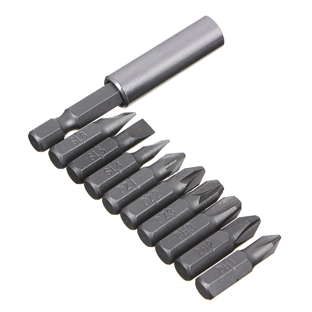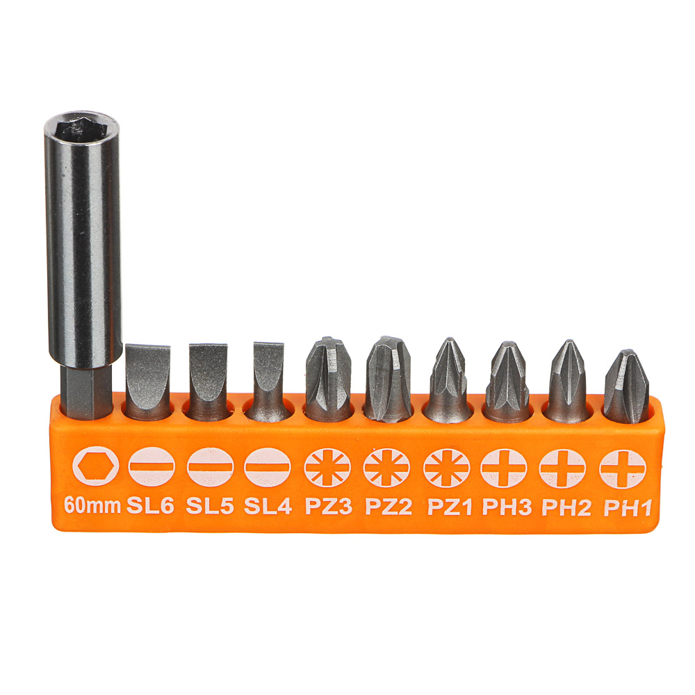 Набор из 10 предметов ЕРМАК включает 9 бит длиной 25 мм и удлинитель-адаптер с надежным магнитным шестигранным держателем для бит размером 60 мм для работы с винтами и шурупами. Биты из легированной стали S2 имеют высокую степень стойкости к коррозии, обладают отличной прочностью, устойчивы к деформации и механическим воздействиям. В комплекте предусмотрены самые популярные типы бит: PH1/2/3, SL4/5/6 и PZ1/2/3. Набор включает мини-подставку для хранения с маркировкой.