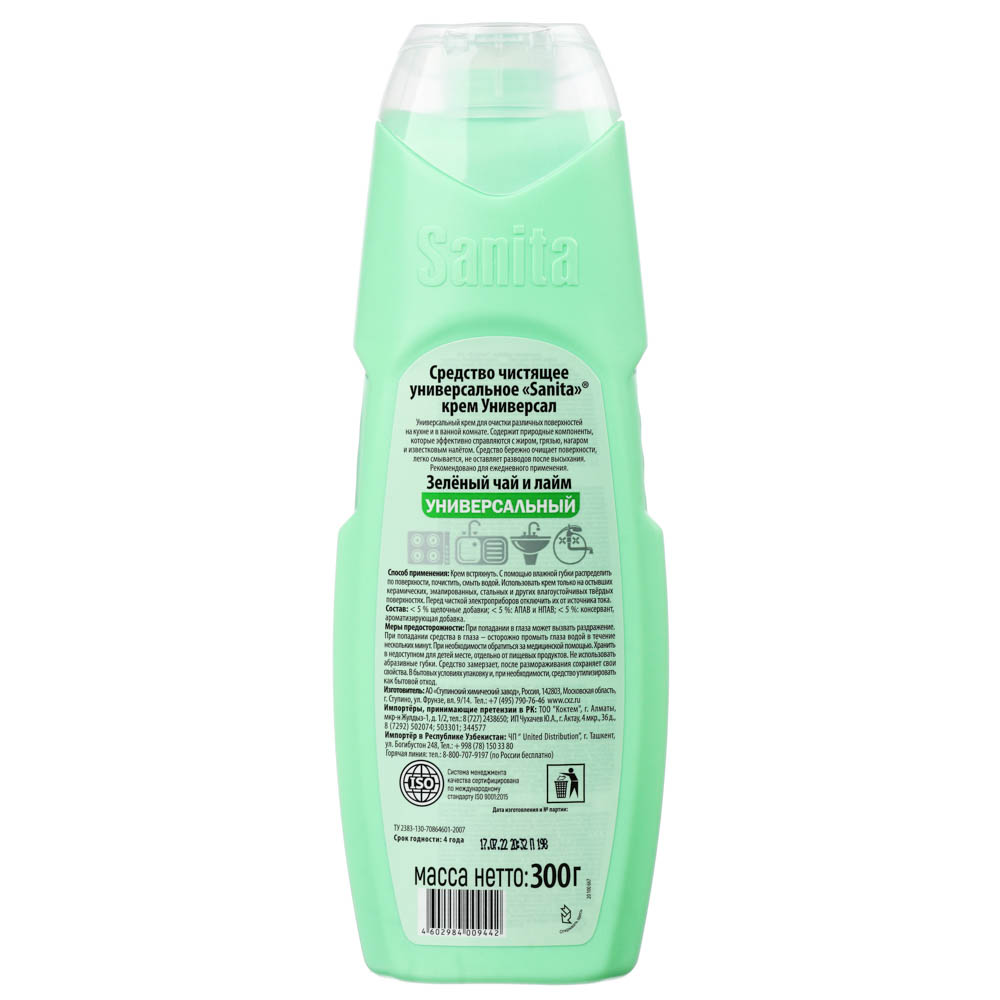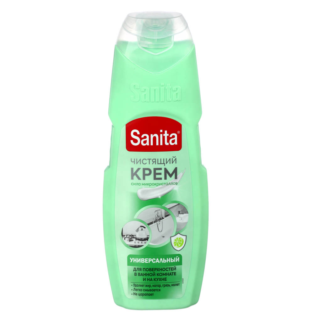 Универсальный крем SANITA с ароматом Зеленый чай и лайм обеспечит бережное очищение всех типов поверхностей в доме. Подходит для сантехники, кухонной плиты, кафеля. Быстро расщепляет жир и снимает известковый налет. Средство легко смывается и не оставляет царапин и разводов. Имеет приятный аромат и удобную кремовую текстуру.
