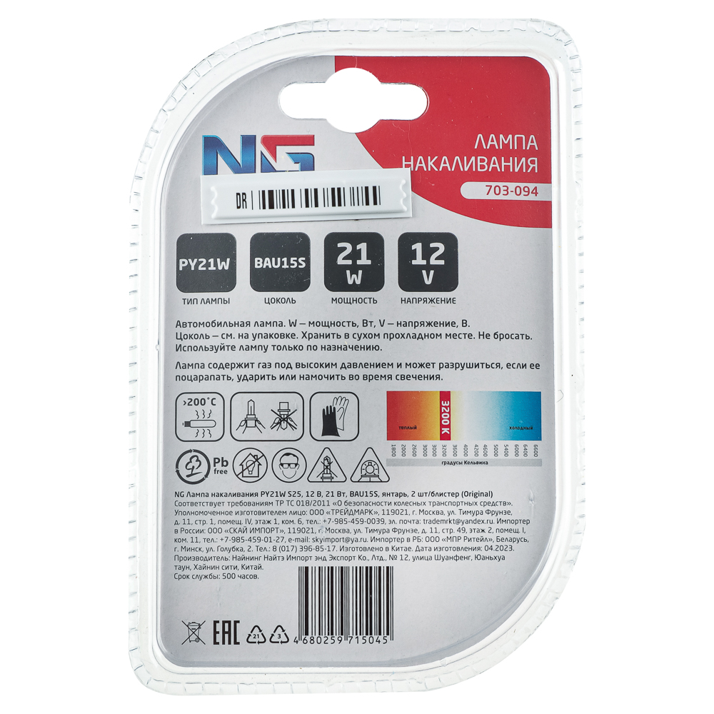 Лампа накаливания NG «Янтарь» типа PY21W с цоколем BAU15S мощностью 21Вт используется в электрической сети автомобиля с напряжением 12В. Цветовая температура 3200 Кельвинов соответствует теплому рассветному или закатному свету, что дает преимущество в виде лучшего обзора в непогоду, так как желтый цвет меньше подвержен рассеиванию и улучшает видимость в дождливый день. Модель лампы имеет увеличенную яркость на 30%. 2 штуки в блистере.