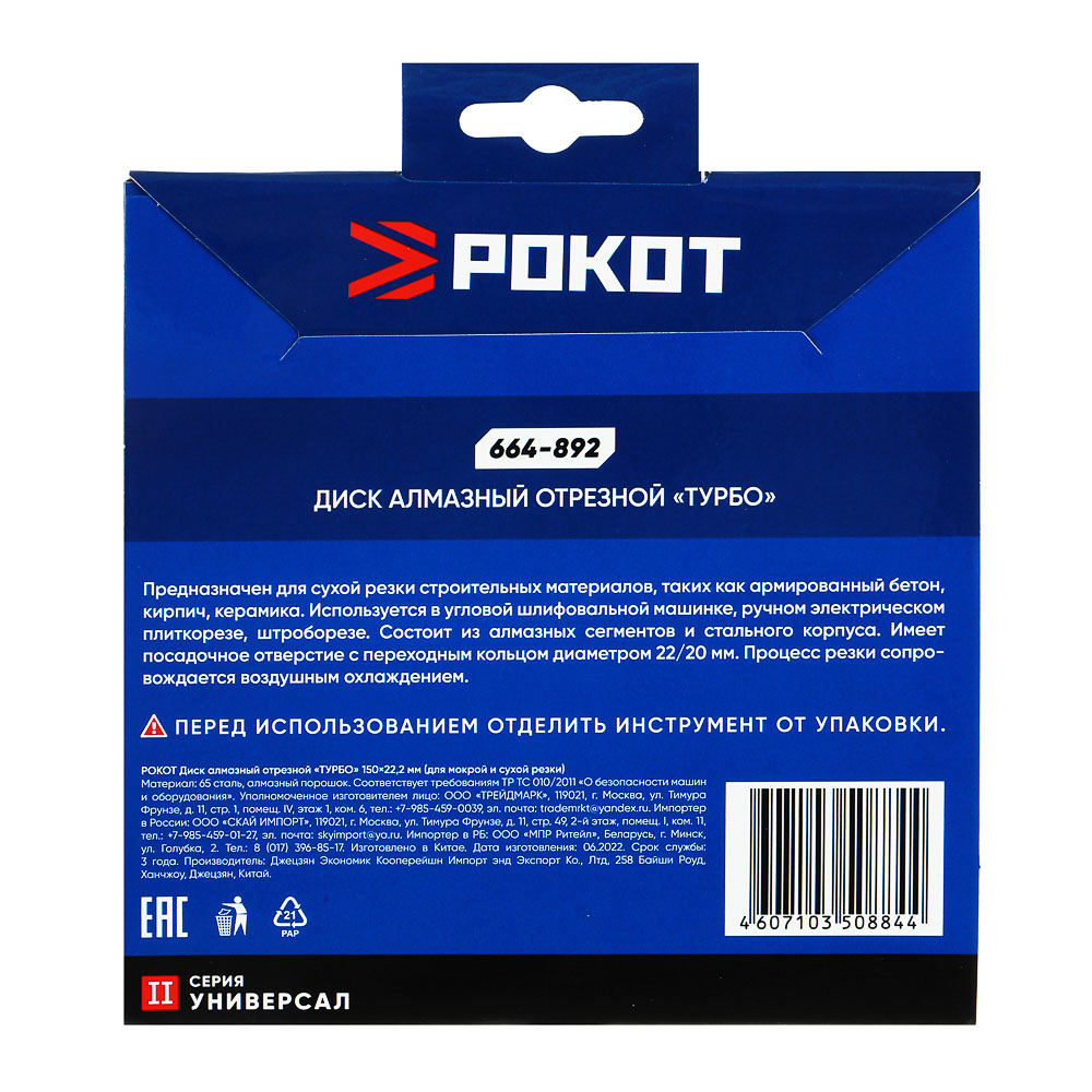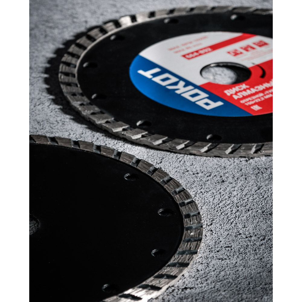 Алмазный отрезной диск РОКОТ "ТУРБО" 150х22,2 мм предназначен для сухой резки бетона, кирпича и керамики. Используется в УШМ, ручном электрическом плиткорезе и штроборезе. Сегменты из алмазного порошка обладают максимальной твердостью, а корпус из 65 стали устойчив к механическому воздействию, не деформируется, прочный и износостойкий. Диск обеспечивает качественный и эффективный рез, подходит для многократного использования. Для работы необходимы средства индивидуальной защиты: наушники, маска-респиратор, очки.