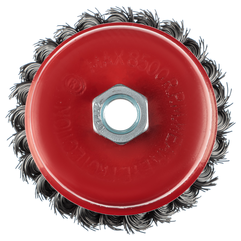 Щетка металлическая ЕРМАК для УШМ «Чашка» 100мм с типом крепления М14 – это насадка для угловой шлифовальной машины, которая применяется для грубой очистки любых металлических поверхностей, пазов и выемок от ржавчины, остатков краски, грязи, а также для зачистки сварных швов. Рабочая часть выполнена из крученой стальной проволоки повышенной прочности, устойчивой к износу и не подверженной коррозии, поэтому изделие рассчитано на длительный срок эксплуатации.