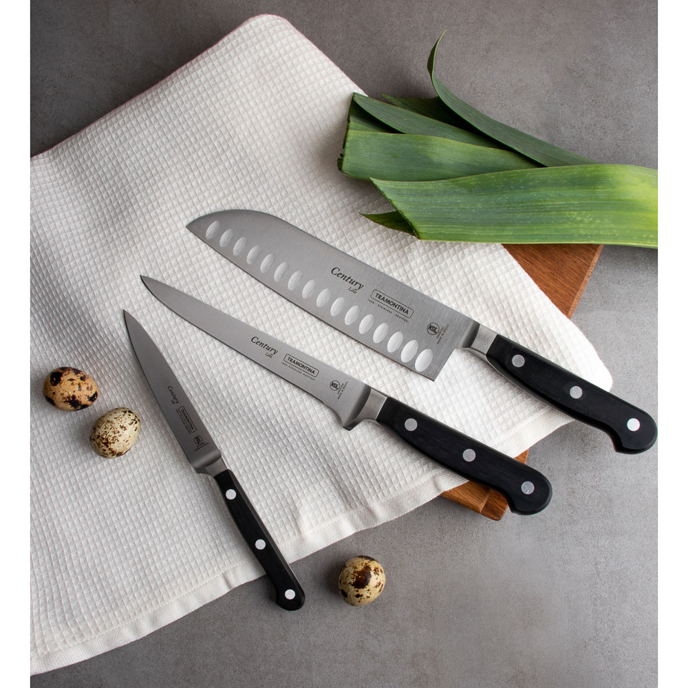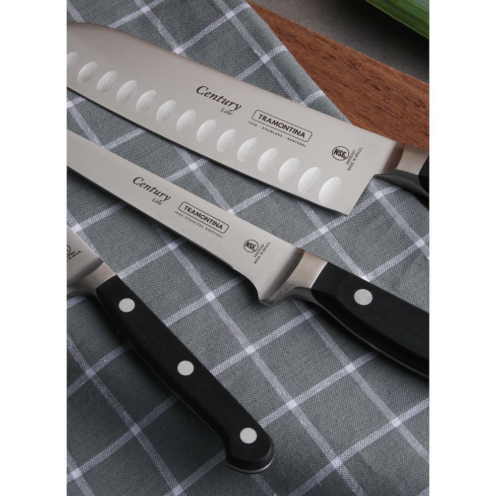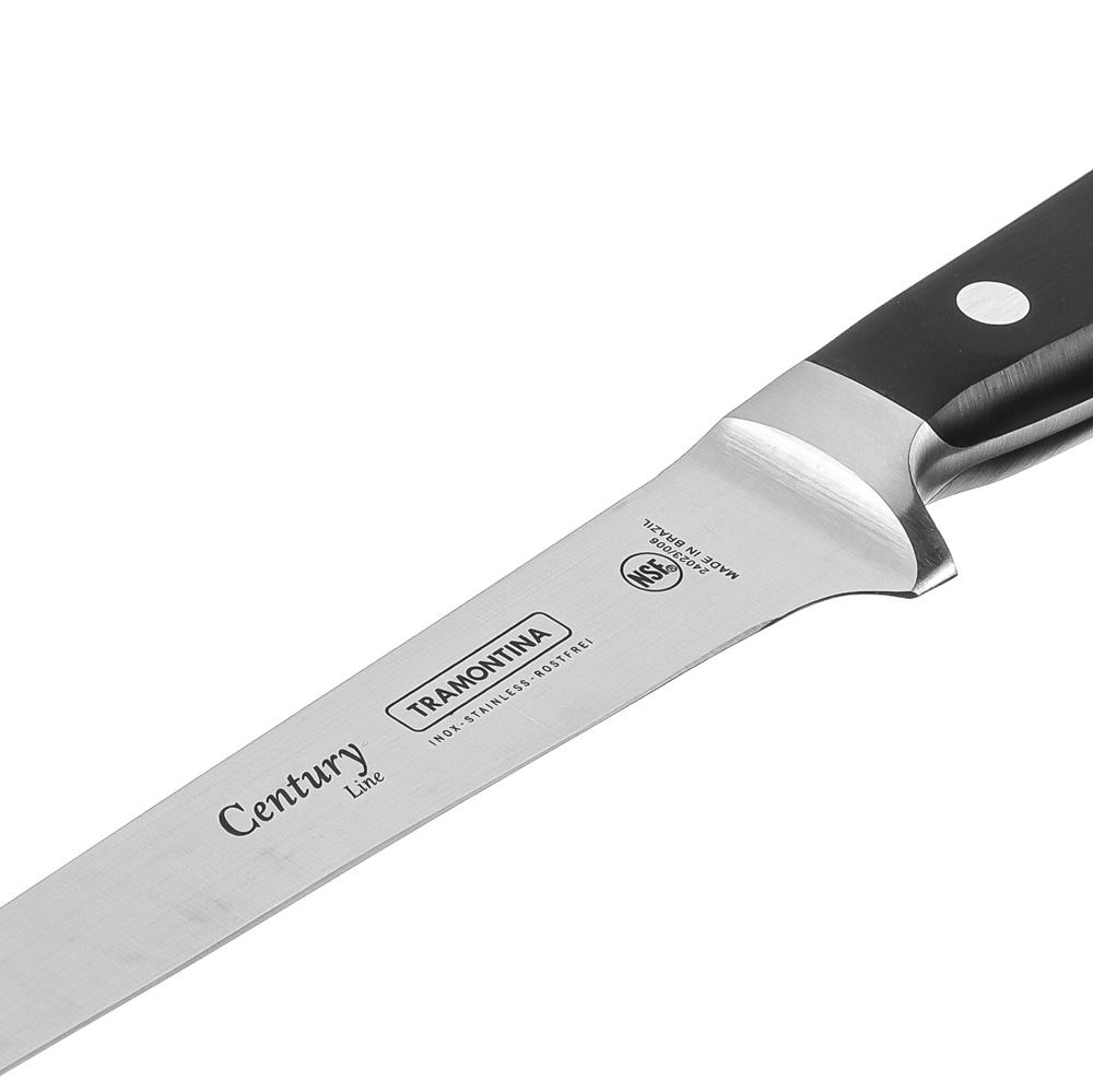 Гибкий филейный нож Tramontina Century помогает получить филе из курицы, рыбы и мяса. Тонко нарезает рыбу для суши. Позволяет получить ровные красивые ломтики ветчины, сыра и колбасы для сервировки закусок. Рукоятка и лезвие являются цельнолитой конструкций, так что ручка не отпадет в самый неподходящий момент.6 причин купить гибкие филейные ножи Tramontina Century:• твердость 55/58 HRC — всего 10 единиц отделяет от твердости алмаза• высокоуглеродистая сталь 1.4110 KRUPP в разы превосходит сталь AISI 420• поликарбонатная рукоять укреплена стекловолокном• «ковка в штампах» — улучшает структуру металла, но при этом снижает стоимость ножа• V-образное лезвие для идеального разреза• долго остается острым, не тускнеет.
