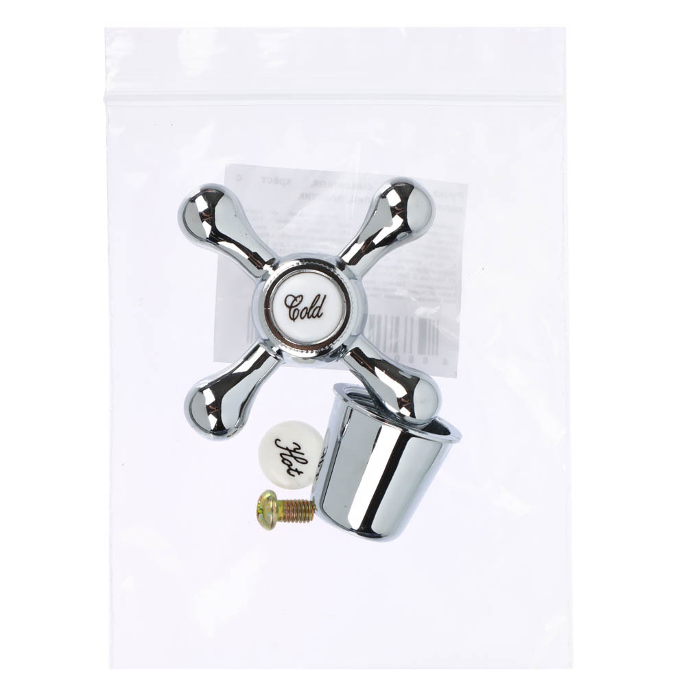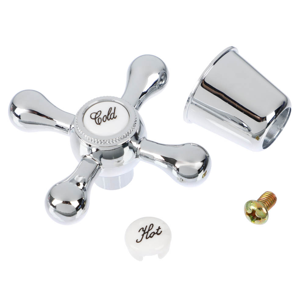 Ручка для смесителя с соединением под квадрат, крестового типа предназначена для кранов и смесителей с вентильным механизмом. Легко и быстро устанавливается на кран-буксу, надежно фиксируется. Изготовлена из пластика, имеет качественное покрытие серебряного цвета, устойчивое к царапинам. Комплект включает 2 заглушки с маркировкой «hot» и «cold» для горячей или холодной воды соответственно.