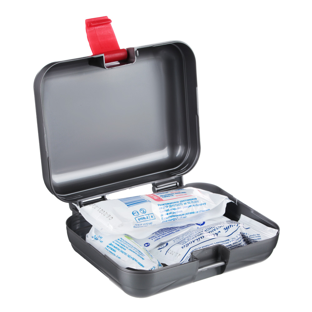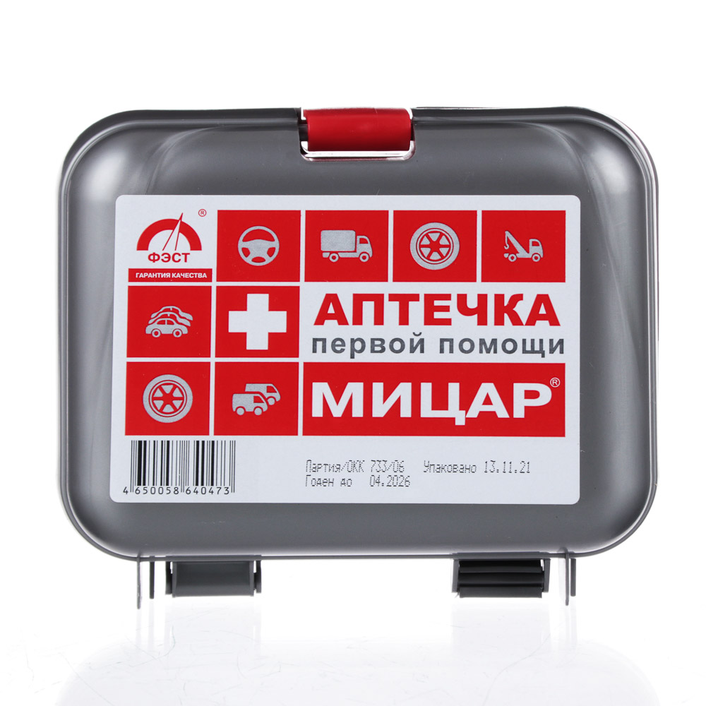 Аптечка Мицар содержит в себе минимальный набор средств для временной остановки кровотечения и перевязки ран, а также для проведения сердечно-легочной реанимации согласно перечню, утвержденному Минздравом. Все средства упакованы в прочный пластиковый кейс, оснащенный удобным замком.Состав:Жгут кровоостанавливающий - 1 шт. Бинт марлевый медицинский нестерильный 5 м х 5 см - 1 шт. Бинт марлевый медицинский нестерильный 5 м х 7 см - 1 шт. Лейкопластырь бактерицидный 1,9 см х 7,2 см - 2 шт. Лейкопластырь бактерицидный 4 см х 10 см - 1 шт. Устройства для проведения искусственного дыхания "Рот-устройство-рот" - 1 шт. Пластиковый кейс с защелками (14х12,5х6 см) - 1 шт.