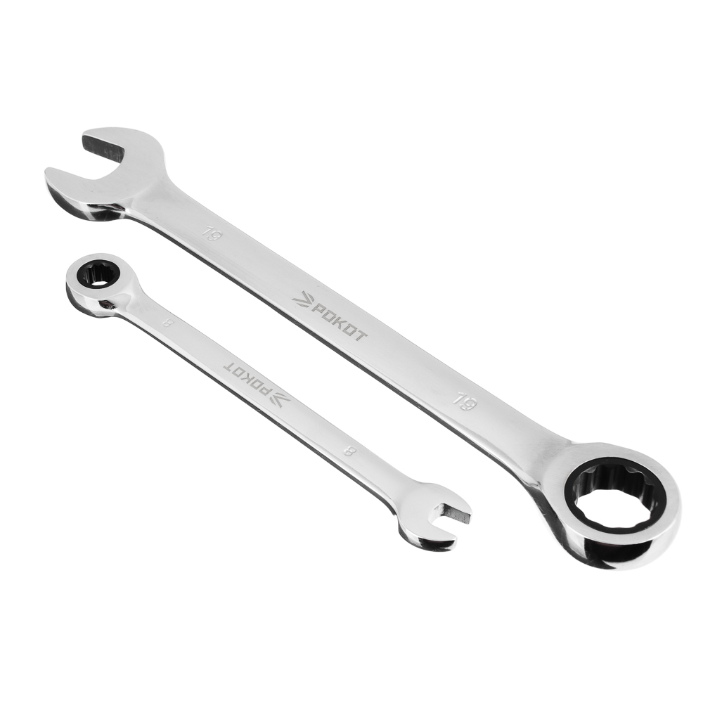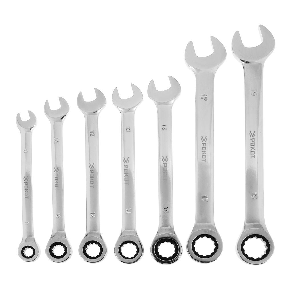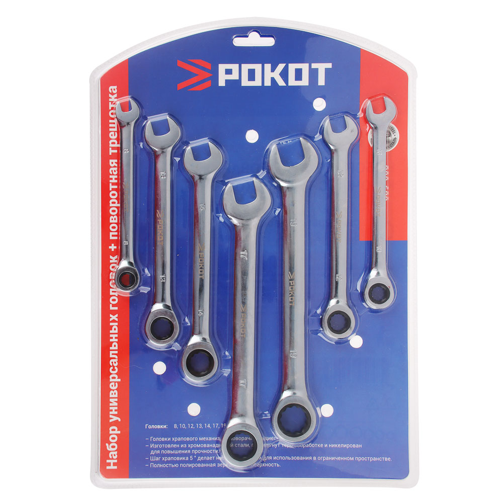 Набор комбинированных ключей с трещоткой РОКОТ содержит универсальные головки храпового механизма самых популярных размеров (8, 10, 12, 13, 14, 17 и 19 мм) и поворотную трещотку на 72 зуба. Инструменты изготовлены из закаленной хромванадиевой стали с оптимальной твердостью 47-52, имеют никелированное покрытие для повышения прочности и полированную зеркальную поверхность. Шаг храповика 5? позволяет с комфортом работать в ограниченном пространстве.