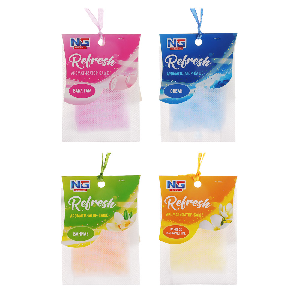 Проматизатор - Саше " Refresh" от бренда NEW GALAXY 20 г - безопасный, экологически чистый, натуральный сухой ароматизатор помещения, белья, салона автомобиля. Прекрасная альтернатива ароматизированным спреям от которых чаще бывает аллергия. Очень прост в применении. Имеет стойкий и длительный аромат. Ароматы в ассортименте : бабл гам, ваниль, океан, райское наслаждение.