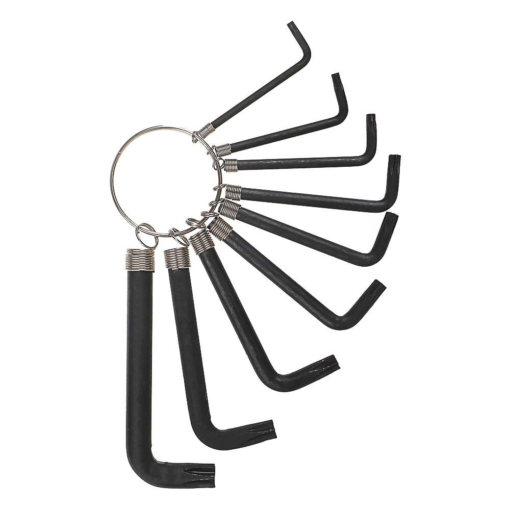 Набор ключей TORX включает 9 предметов с размерным рядом от T9 до T45. Ключи соединены в комплект при помощи кольца для удобства хранения и транспортировки. Качественная сталь обеспечивает высокие эксплуатационные свойства и повышенную прочность, что предохраняет шлицы от деформации.