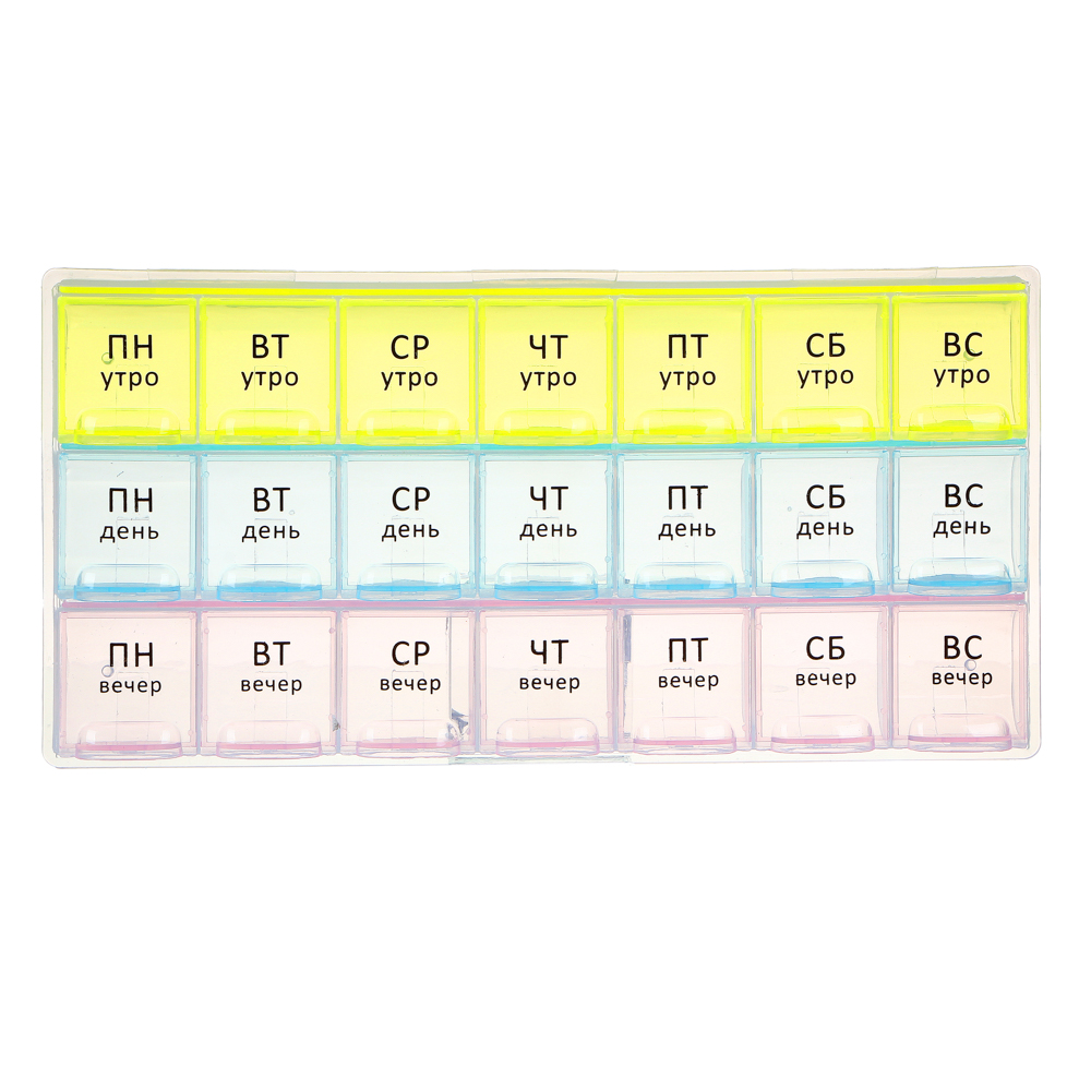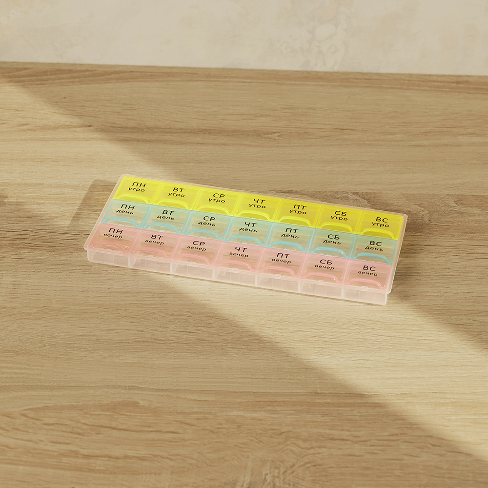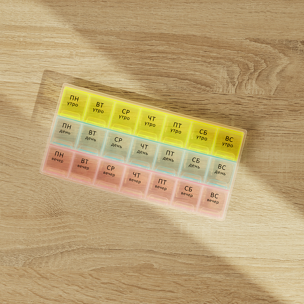 Врач выписал препараты для ежедневного приема строго в определенное время суток? Чтобы не держать лишнюю информацию в голове и не пропустить прием лекарств, витаминов или БАДов, был создан Бокс для таблеток VETTA. Пластиковый бокс имеет 21 отсек с маркировкой по дням недели и времени суток – утро, день и вечер. В каждый отсек поместится несколько таблеток или капсул. Заготовьте препараты заранее и вам не придется вспоминать, приняли ли вы лекарство в нужное время.