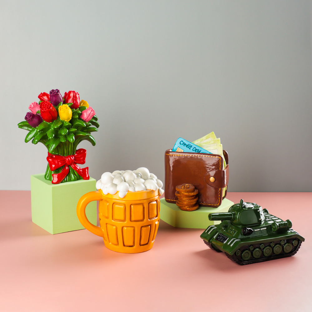 Компактная копилка из полистоуна Арт. 112 – это не просто аксессуар для монет, но и интересная деталь интерьера. Фигурка в виде букета, пивной кружки, танка или бумажника смотрится привлекательно и оригинально, украсит рабочий стол, будет интересно смотреться на полке или комоде, разнообразит интерьер кабинета, гостиной или спальни. Может стать подарком на 8 марта или 23 февраля. 4 дизайна в ассортименте.