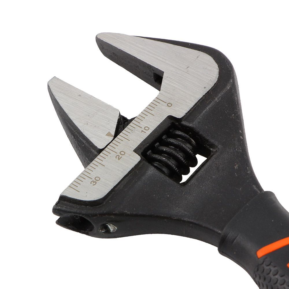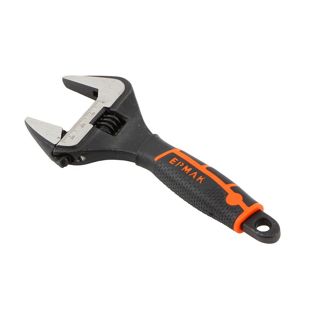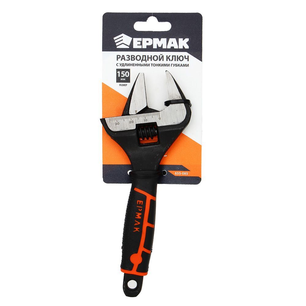 Разводной ключ ЕРМАК с удлиненными тонкими губками 150 мм применяется для монтажа и демонтажа крепежа в процессе сантехнических и других монтажно-ремонтных работ и способен заменить целый набор гаечных ключей. Снабжен мерной шкалой для удобства регулировки степени открытия. Тонкие губки позволяют работать с мелкими деталями, а также облегчают работу в ограниченном пространстве. Высокопрочная сталь не деформируется с течением времени. Прорезиненная рукоять с отверстием для подвеса не натирает ладонь и обеспечивает надежный хват.