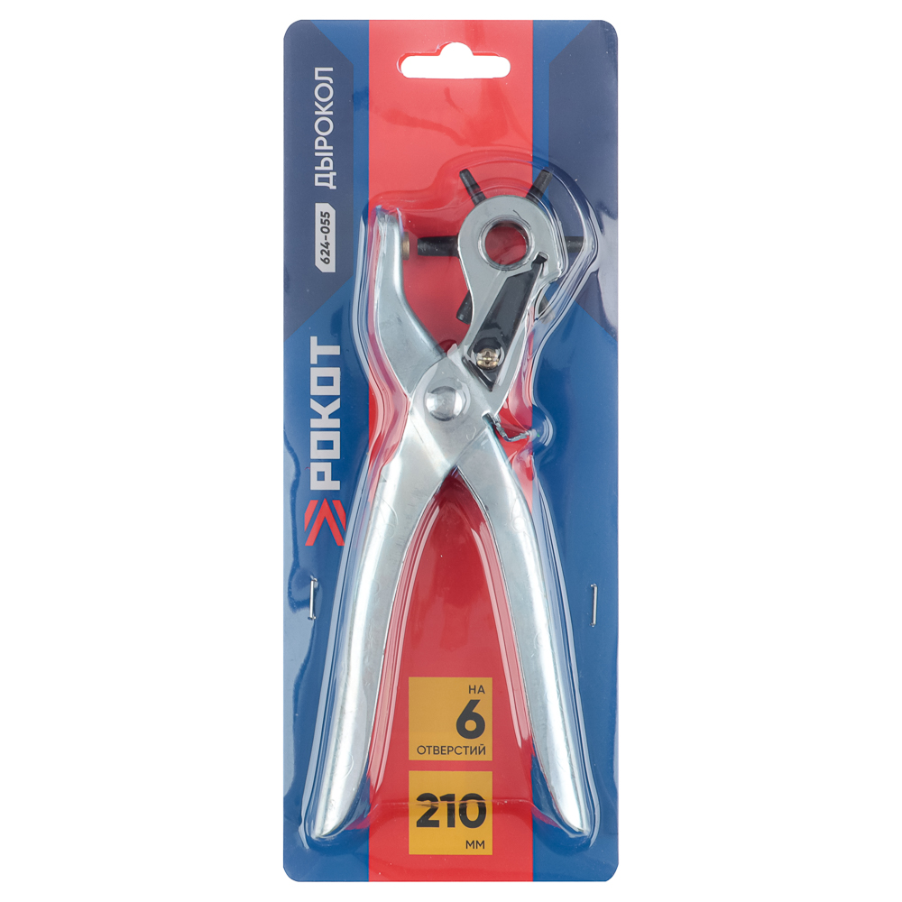 Дырокол РОКОТ на 6 отверстий длиной 21 см – незаменимый инструмент для пробивания отверстий в плотных материалах. Подходит для работы с картоном, тканью, резиной, кожей, пластиком и другими материалами. Имеет удобный крутящийся механизм смены насадок. Дырокол имеет широкую сферу применения: пригодится в быту, в швейном и кожевенном деле, в ремонте и рукоделии. Выполнен из углеродистой стали, прочный, выдерживает высокие нагрузки. Размер насадок: от 2 до 4,5 мм с шагом в 0,5 мм.