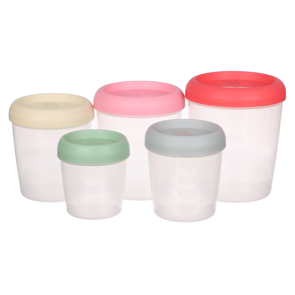 Набор банок для продуктов с завинчивающейся крышкой в количестве 5 штук изготовлен из пластика. Банки для сыпучих продуктов предназначены для хранения муки, круп, соли, сахара, соды, макаронных изделий, орехов, фасоли, кофе и других видов сыпучих продуктов. Крышка плотно закручивается, не пропуская запахи. Прозрачный корпус банки позволяет легко определить содержимое и вовремя пополнить запасы. Легко моются, не занимают много места на полке. Объемы: 1,4 л; 1,05 л; 0,75 л; 0,55 л; 0,4 л.