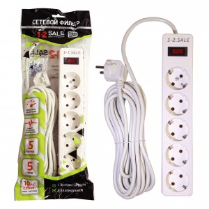 1-2.SALE сетевой фильтр ПВС 3х0.75 5роз. 5м 10А БЕЛЫЙ, земля, выкл. E1М 901419
