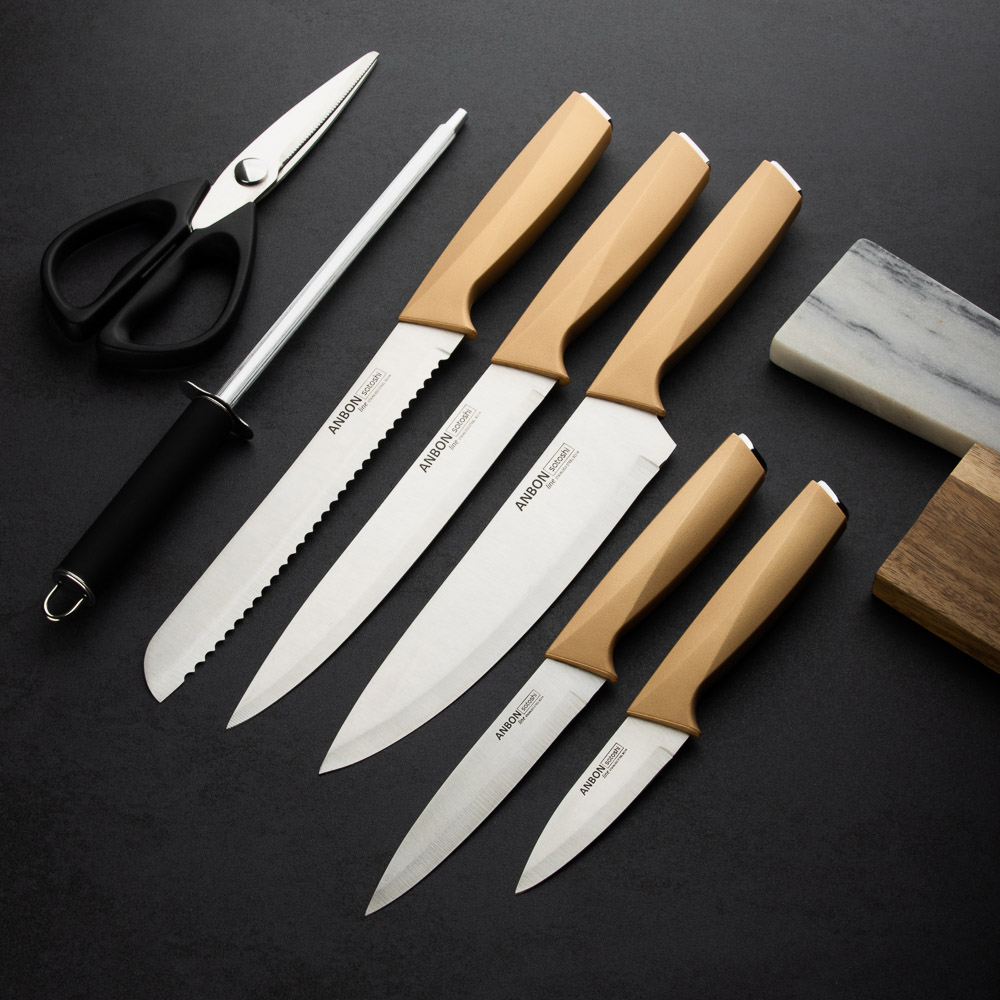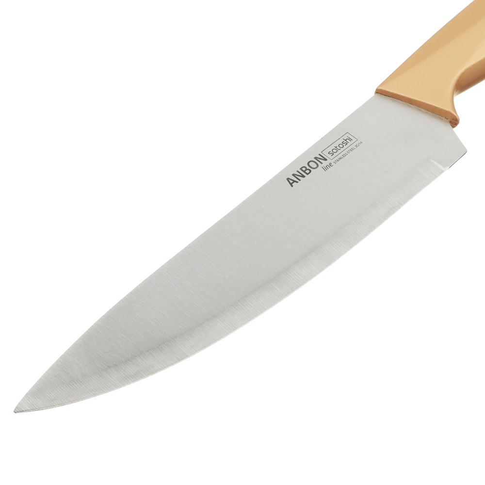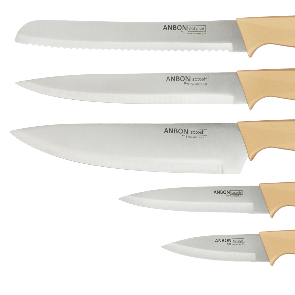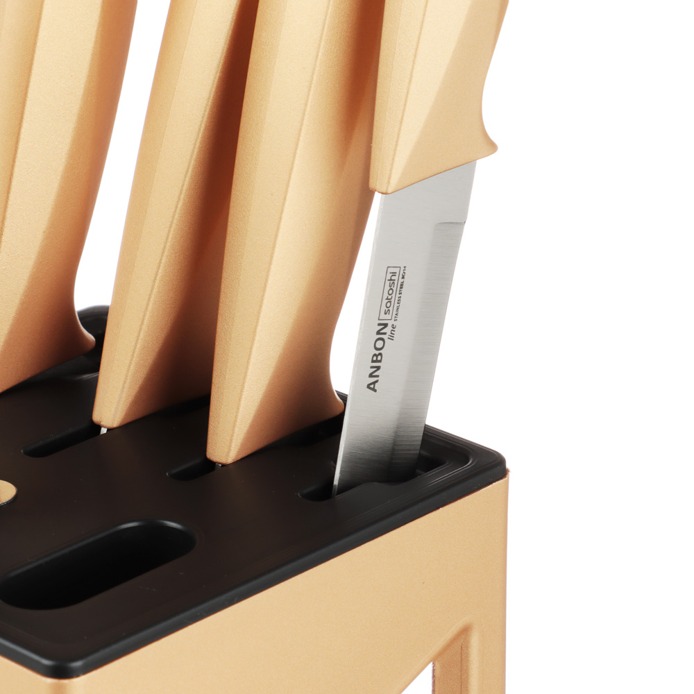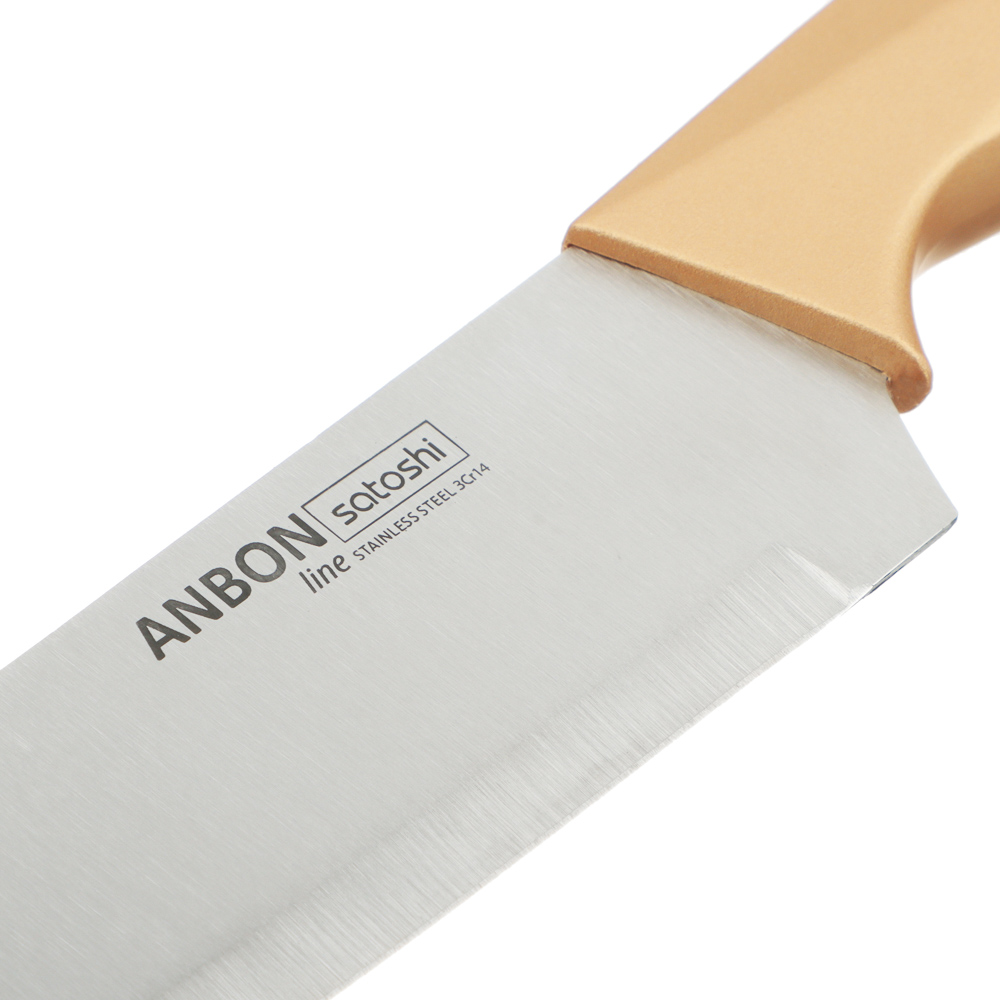 Набор кухонных ножей SATOSHI «Анбон» из 7 предметов на вращающейся подставке – это практичный комплект для повседневного использования на кухне. Включает ножи разных форм и размеров, при помощи которых можно осуществлять любые манипуляции с продуктами в процессе приготовления блюд: нарезку, чистку, обвалку, шинковку. Нержавеющая сталь не подвержена коррозии, имеет антибактериальное покрытие, а также антиналипающее покрытие, что делает процесс нарезки более комфортным и быстрым. Эргономичные рукоятки не выскальзывают из рук и обеспечивают надежный хват. Набор также включает ножницы для нарезки зелени, вскрытия упаковок и разделки птицы. Вращающаяся подставка обеспечивает быстрый и беспрепятственный доступ к каждому предмету. Состав набора: 20 см шеф нож, 20 см нож для нарезки, 20 см нож для хлеба, 12,7 см универсальный нож, 9 см нож для чистки овощей и фруктов, мусат для заточки, ножницы. Толщина лезвия ножей 1,5 мм.