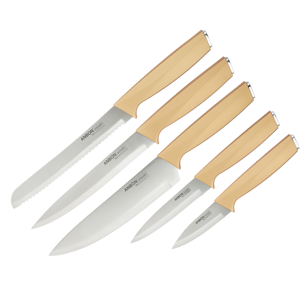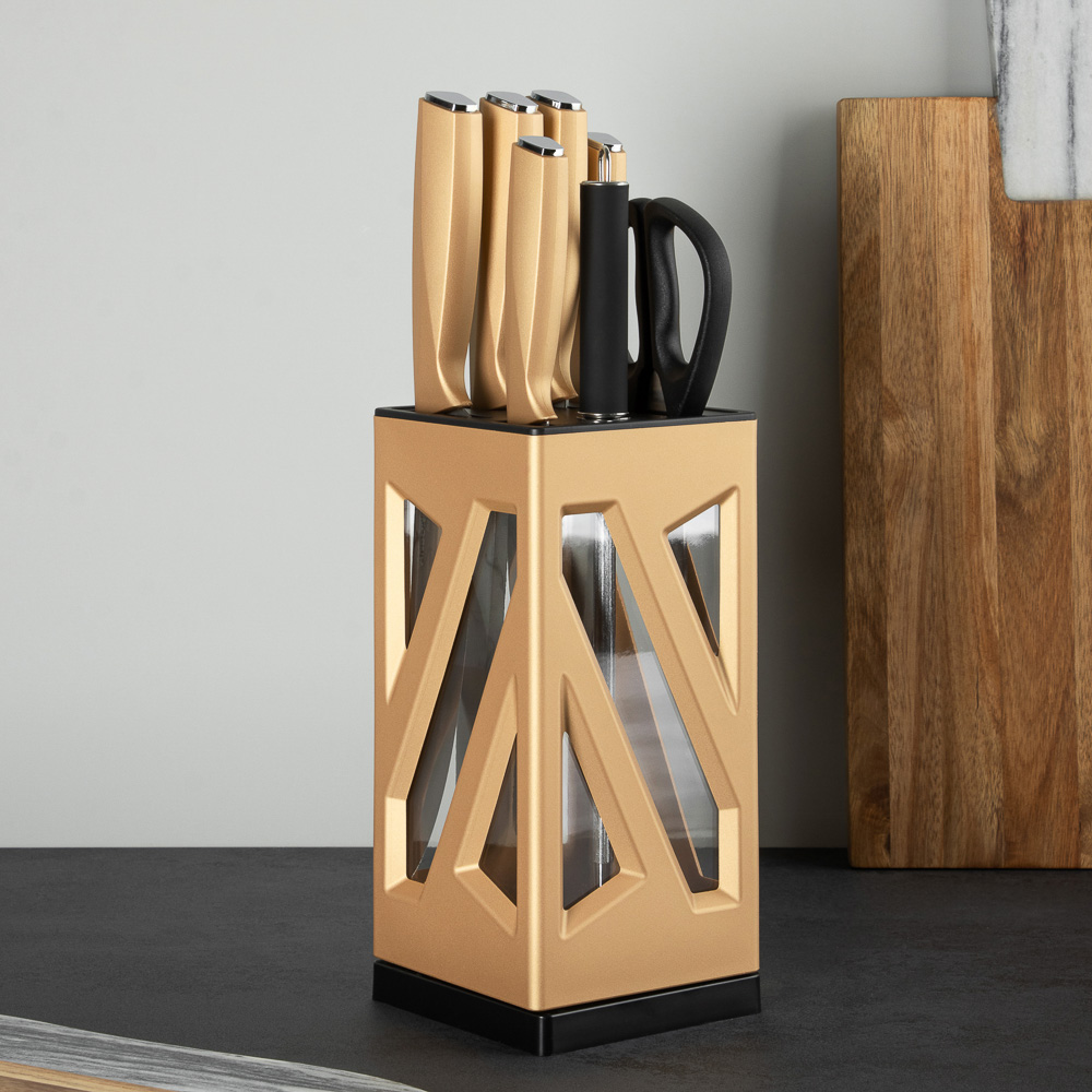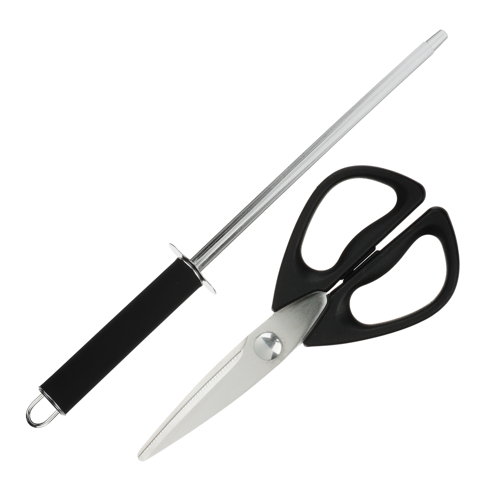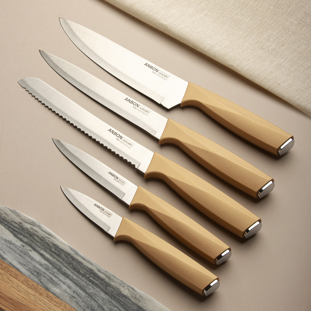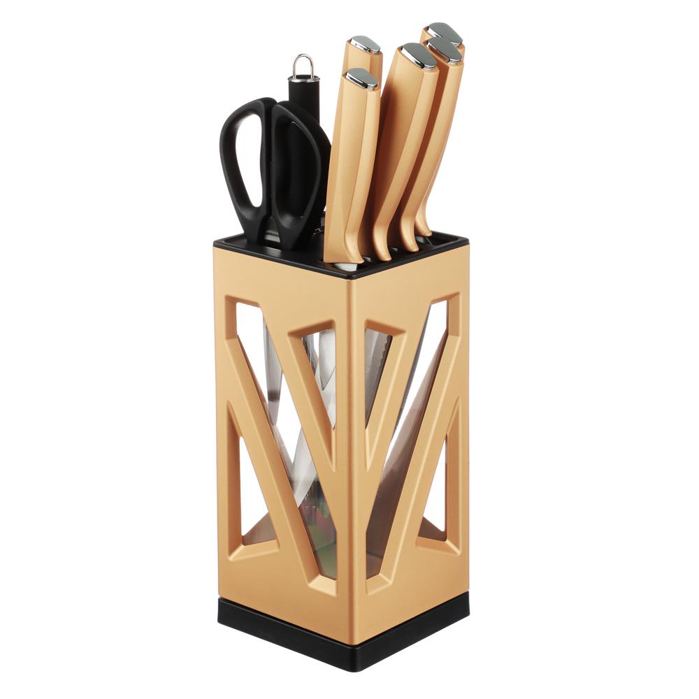Набор кухонных ножей SATOSHI «Анбон» из 7 предметов на вращающейся подставке – это практичный комплект для повседневного использования на кухне. Включает ножи разных форм и размеров, при помощи которых можно осуществлять любые манипуляции с продуктами в процессе приготовления блюд: нарезку, чистку, обвалку, шинковку. Нержавеющая сталь не подвержена коррозии, имеет антибактериальное покрытие, а также антиналипающее покрытие, что делает процесс нарезки более комфортным и быстрым. Эргономичные рукоятки не выскальзывают из рук и обеспечивают надежный хват. Набор также включает ножницы для нарезки зелени, вскрытия упаковок и разделки птицы. Вращающаяся подставка обеспечивает быстрый и беспрепятственный доступ к каждому предмету. Состав набора: 20 см шеф нож, 20 см нож для нарезки, 20 см нож для хлеба, 12,7 см универсальный нож, 9 см нож для чистки овощей и фруктов, мусат для заточки, ножницы. Толщина лезвия ножей 1,5 мм.