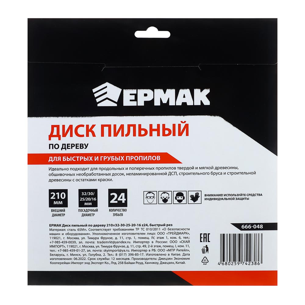 Диск пильный по дереву ЕРМАК 210х32-30-25-20-16 Z24 применяется для быстрых и грубых пропилов продольного и поперечного типа. Устанавливается на циркулярную пилу. Предназначен для мягкой и твердой древесины, обшивочных необработанных досок, неламинированной ДСП, строительного бруса и строительной древесины с остатками краски. 24 острых зубьев обеспечивают быстрый рез и отлично держат заточку. Максимальная рабочая скорость вращения – 7000 оборотов в минуту.