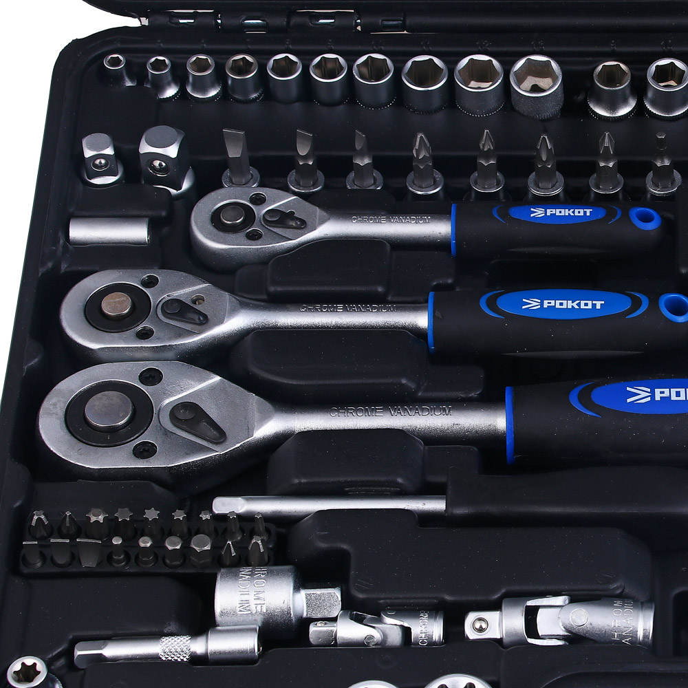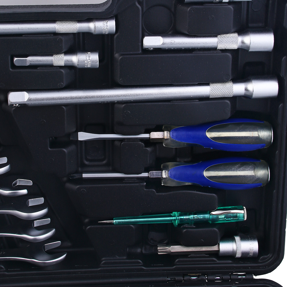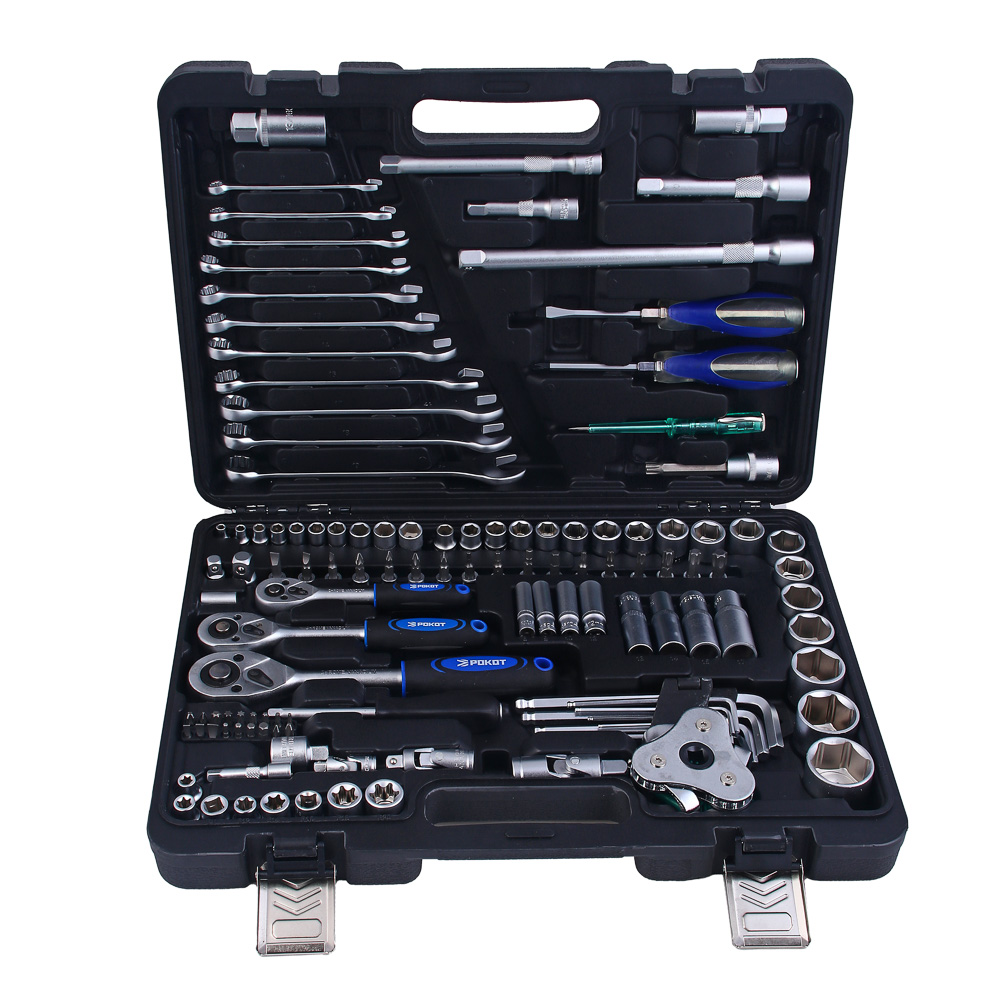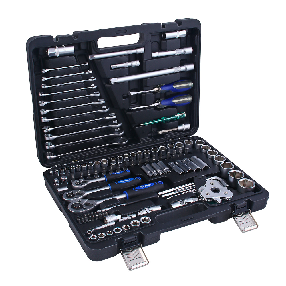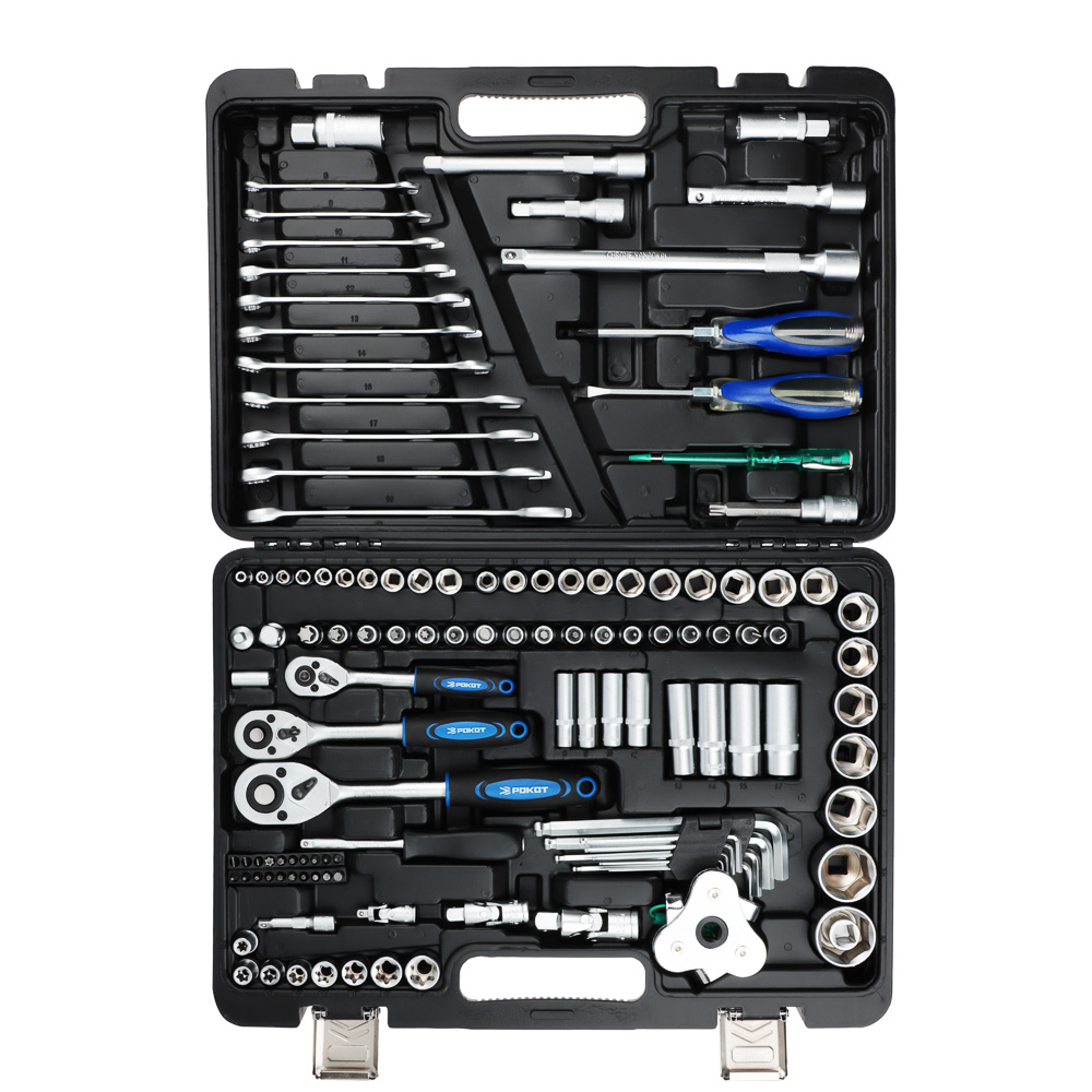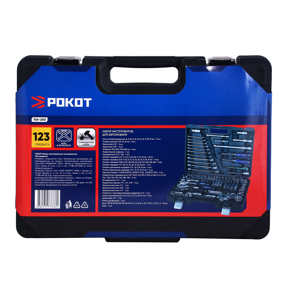 Набор автомобильных инструментов РОКОТ включает 123 предмета, необходимых для обслуживания и ремонта транспортных средств, а также содержит инструменты, которые пригодятся в быту для проведения мелких ремонтных работ. Удобный и прочный пластиковый кейс представляет собой органайзер, в котором всегда легко можно найти необходимый предмет. Набор содержит свечные головки, комбинированные ключи, удлинители, отвертки, торцевые головки и биты, а также трещоточные ключи. Все предметы выполнены из углеродистой стали повышенной прочности, отличаются износостойкостью и устойчивостью к деформации. Прекрасный подарок для автовладельца.