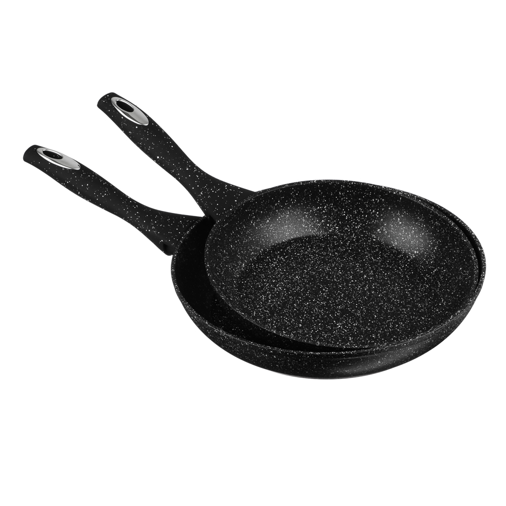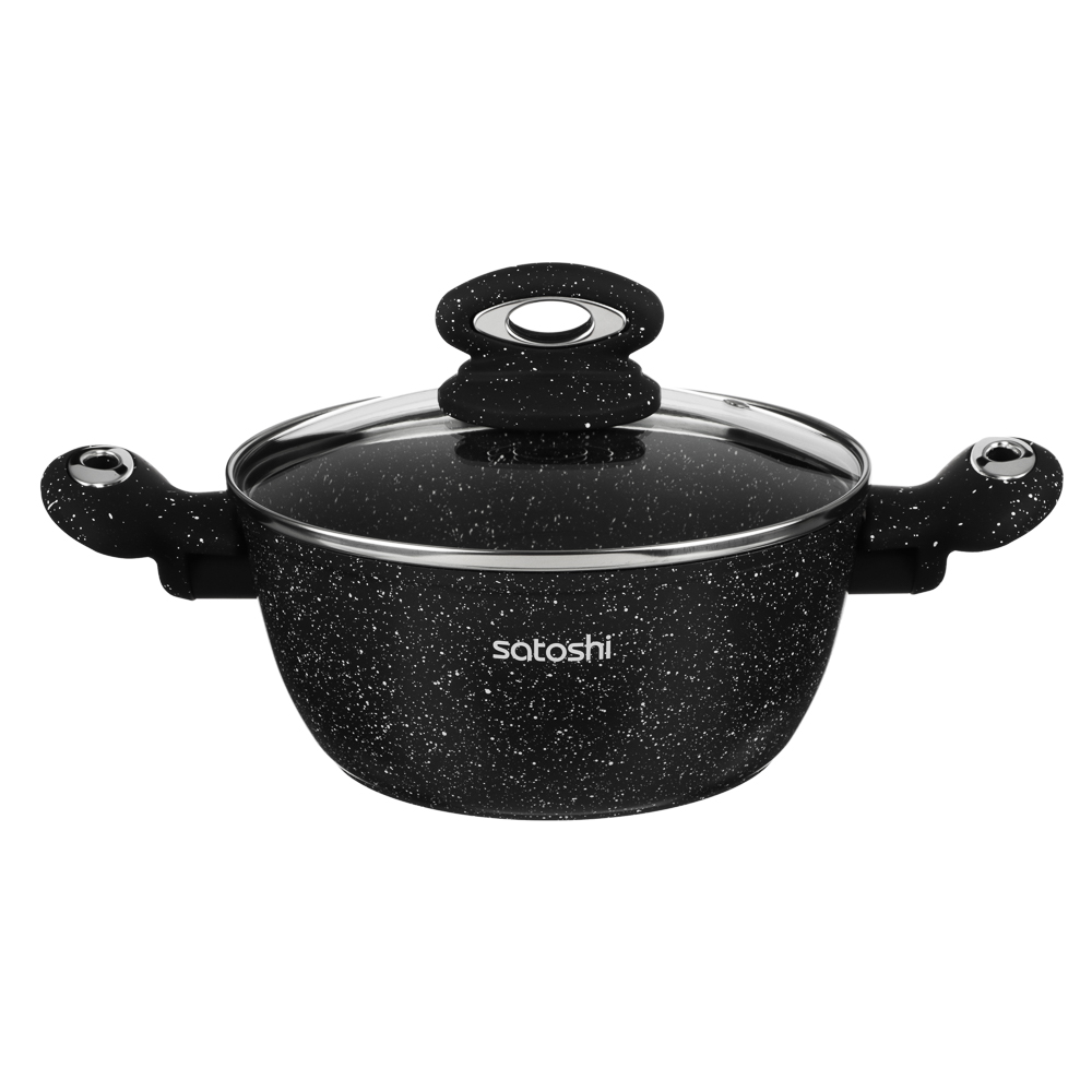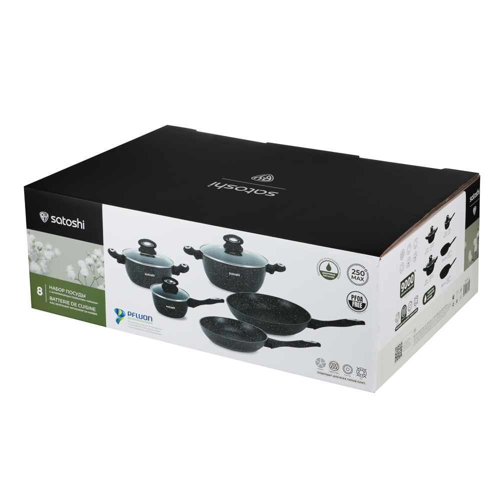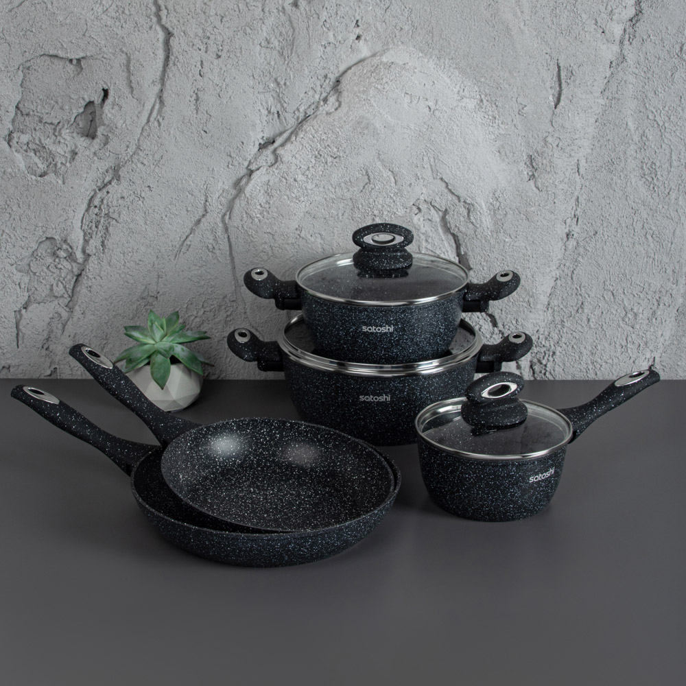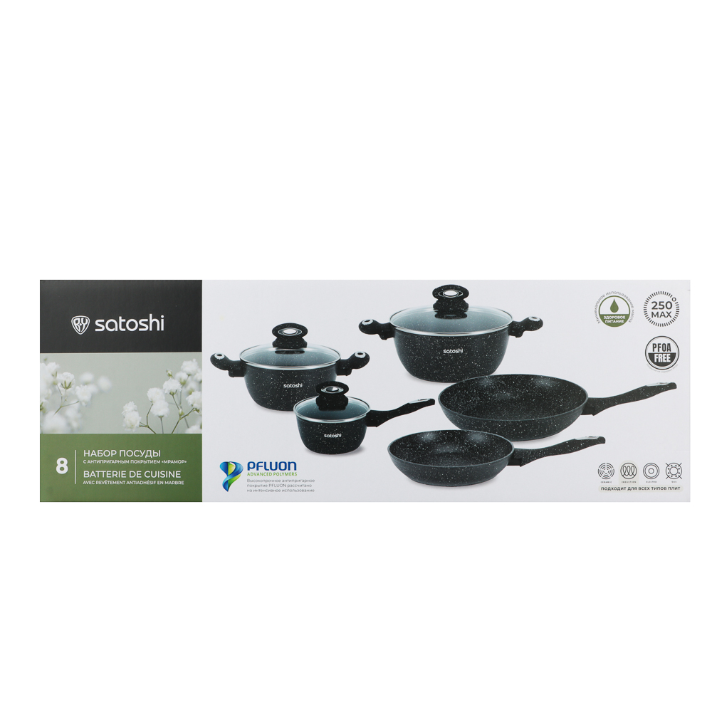 Качественная посуда для приготовления пищи – не только бытовая необходимость, но также залог приготовления вкусных блюд и важная составляющая дизайна кухни. Набор посуды из 8-и предметов SATOSHI Валанс состоит из кастрюли и крышек на 2,3 л и 3,8 л, ковша и крышки на 1,3 л и сковородок диаметром 24 и 28 см. Станет необходимым помощником на кухне каждый день.• Вся посуда изготовлена из литого алюминия.• Имеет внутреннее антипригарное покрытие с «мраморным» эффектом.• Приятные на ощупь не нагревающиеся эргономичные ручки с силиконовым напылением.• Крышку можно использовать как для сотейника, так и для сковороды.• Посуда будет шикарно смотреться в интерьере современной кухни благодаря стильному дизайну в практичном черном цвете.