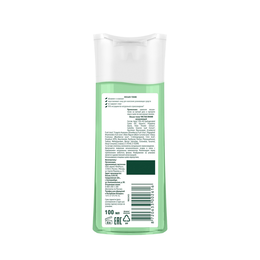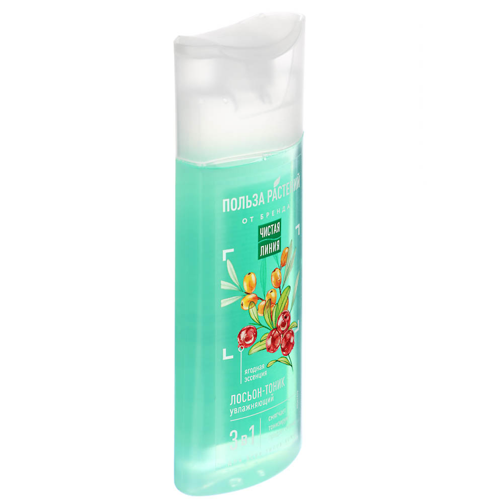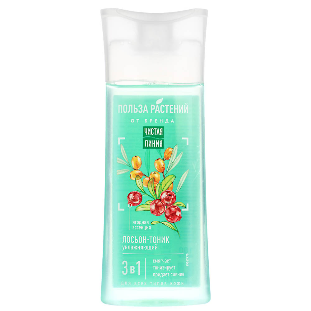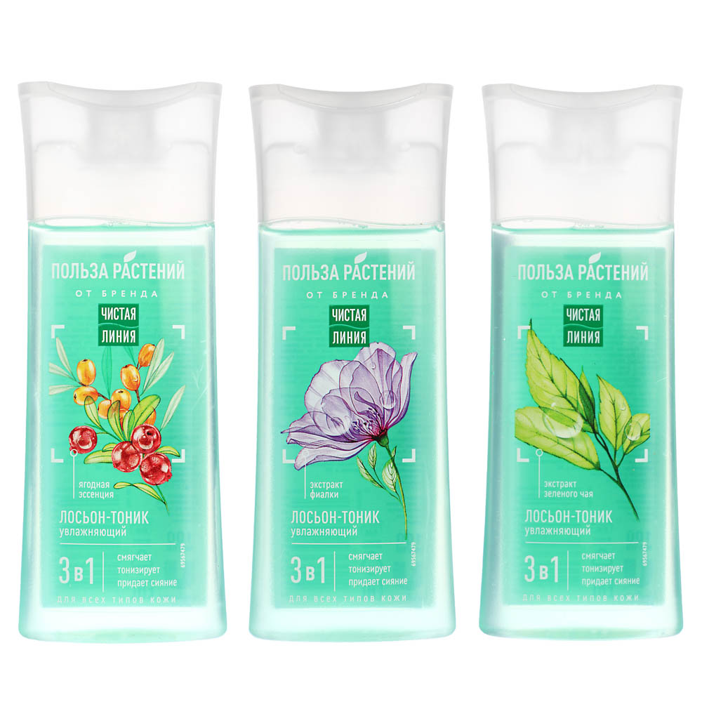 Лосьон-тоник Чистая линия увлажняющий «Польза растений» 3 в 1 обеспечивает разнонаправленный уход за кожей: смягчает, тонизирует и увлажняет кожу, придает ей благородное сияние. Натуральные растительные экстракты глубоко питают и защищают клетки эпидермиса от воздействия вредных внешних факторов. Подходит для всех типов кожи. Не оставляет ощущение липкости и сухости. Доступно 3 варианта: экстракт зеленого чая, экстракт фиалки и ягодная эссенция.