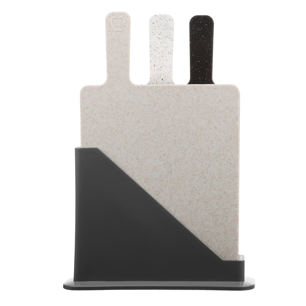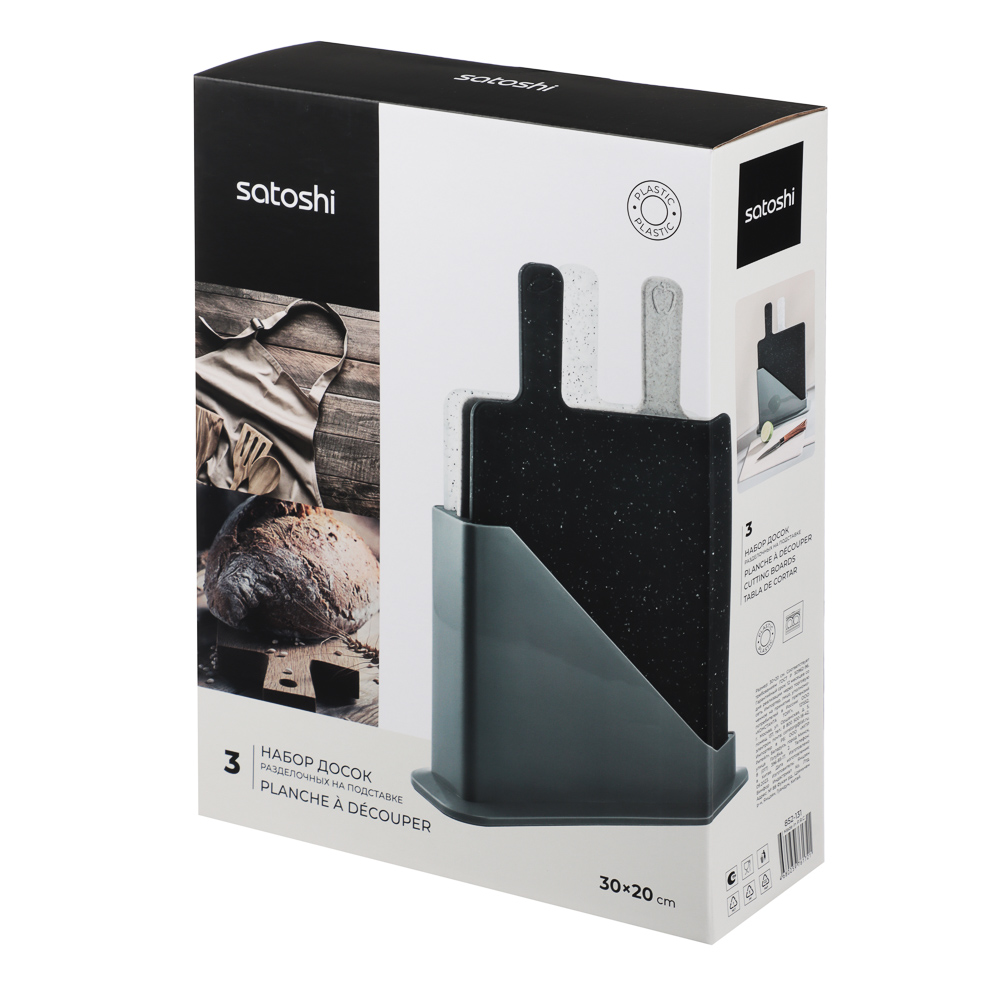 Набор разделочных досок на подставке набор 4 шт., 30х20 см является незаменимым атрибутом любой кухни. Подставка для разделочных досок выполнена из прочного, безопасного пластика, который помогает сохранять остроту ножей, материал не впитывает в себя запахи и масла. Поверхность досок оснащена желобками для того, чтобы сок от продуктов не стекал на поверхность стола, также каждая доска обладает уникальным рельефом для оптимизации нарезки соответствующего продукта, а на обратной стороне есть противоскользящие накладки.