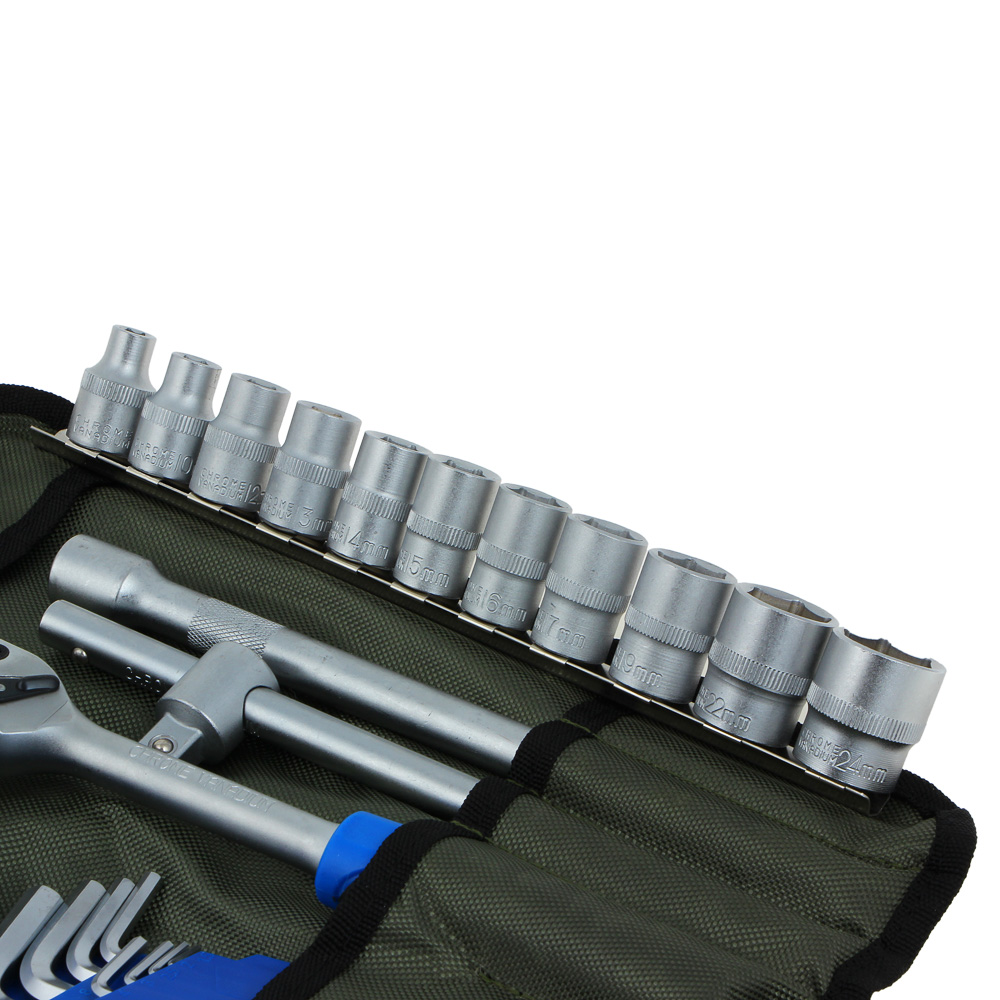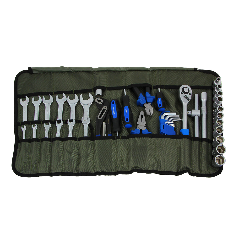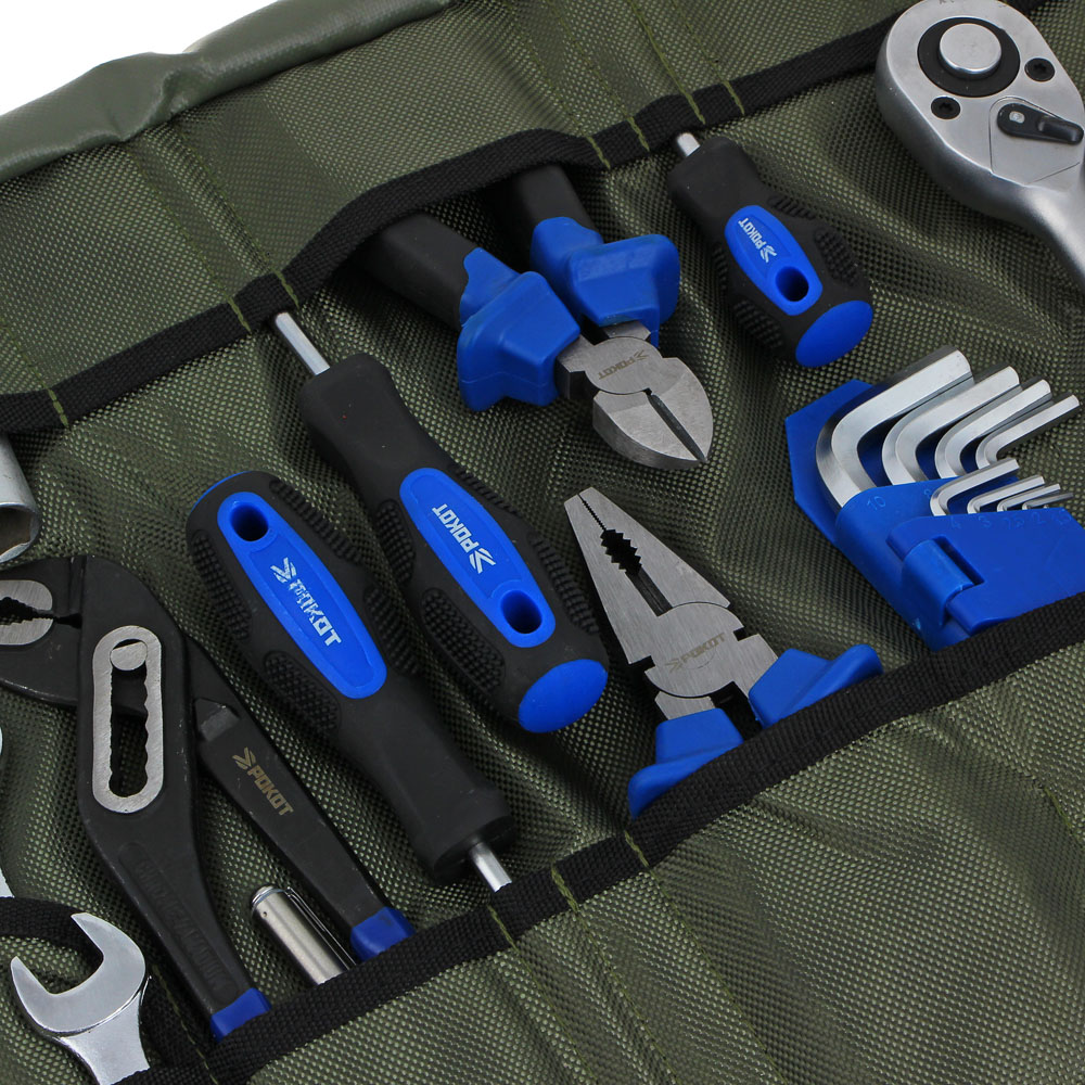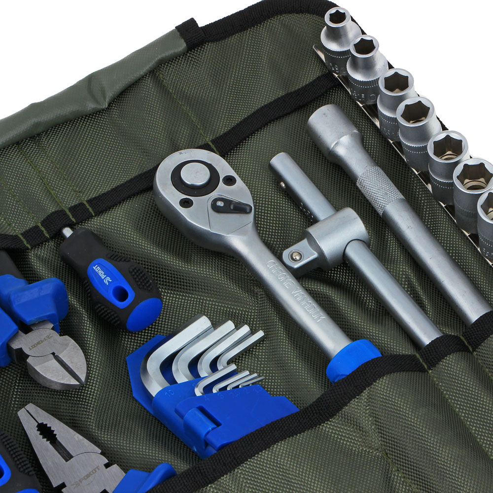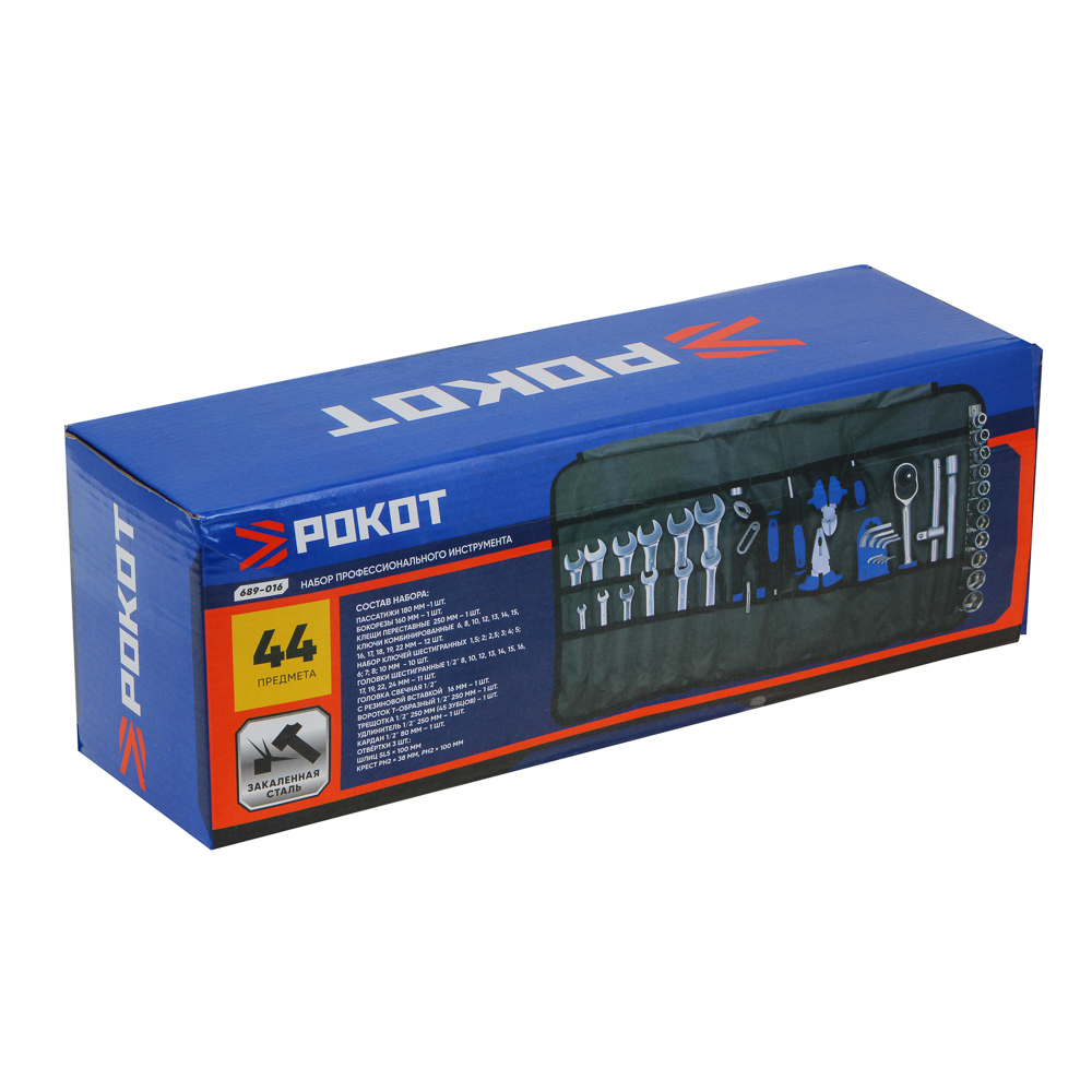 Набор профессионального инструмента РОКОТ в чехле включает 44 предметов и предназначен для монтажа и демонтажа резьбовых соединений. В комплекте имеются разные типы отверток с держателями для бит, трещоточный ключ, адаптеры для бит, головки и биты разных размеров. Все металлические элементы выполнены из высококачественной хромованадиевой стали, устойчивой к износу и коррозии. Набор может стать отличным подарком для мастера.Комплектация:• Пассатижи 180 мм-1шт;• Бокорезы 160мм-1шт;• Клещи переставные 250мм-1шт;• Ключи комбинированные 6,8,10,12,13,14,15,16,17,18,19,22мм-12шт;• Набор ключей шестигранных 1,5;2;2.5;3;4;5;6;7;8;10мм-10шт;• Головки шестигранные 1/2" 8,10,12,13,14,15,16,17,19,22,24мм-11шт;• Головка свечная 1/2";• С резиновой вставкой 16мм-1шт;• Вороток Т-ОБРАЗНЫЙ 1/2" 250 мм-1шт;• Трещотка 1/2" 250мм (45 зубцов) -1шт;• Удлинитель 1/2" 250мм-1шт;• Кардан 1/2" 80мм-1шт;• Отвертки 3шт:• Шлиц SL5х100мм;• Крест РН2х38мм, РН2х100мм.