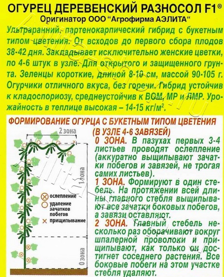 Ультраранний, партенокарпический гибрид с букетным типом цветения. От всходов до первого сбора плодов 38-42 дня. Закладывает исключительно женские цветки, по 4-6 штук в узле. Для открытого и защищенного грунта. Зеленцы короткие, длиной 8-10 см, массой 90-105 г. Огурчики отличного вкуса, без горечи. Гибрид устойчив к кладоспориозу, среднеустойчив к ВОМ, МР и ЛМР. Урожайность в теплице высокая – 15-17 кг/м2.