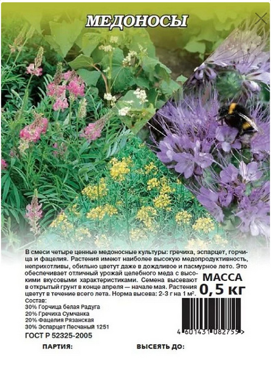 В смеси четыре ценные медоносные культуры: гречиха, эспарцет, горчица и фацелия. Растения имеют наиболее высокую медопродуктивность, неприхотливы, обильно цветут даже в дождливое и пасмурное лето. Это обеспечивает отличный урожай целебного меда с высокими вкусовыми характеристиками. Семена высевают в открытый грунт в конце апреля — начале мая. Растения цветут в течении всего лета. Норма высева: 2-3 г на 1 м?.