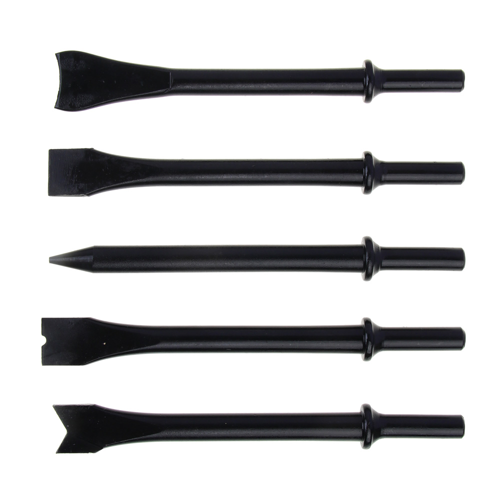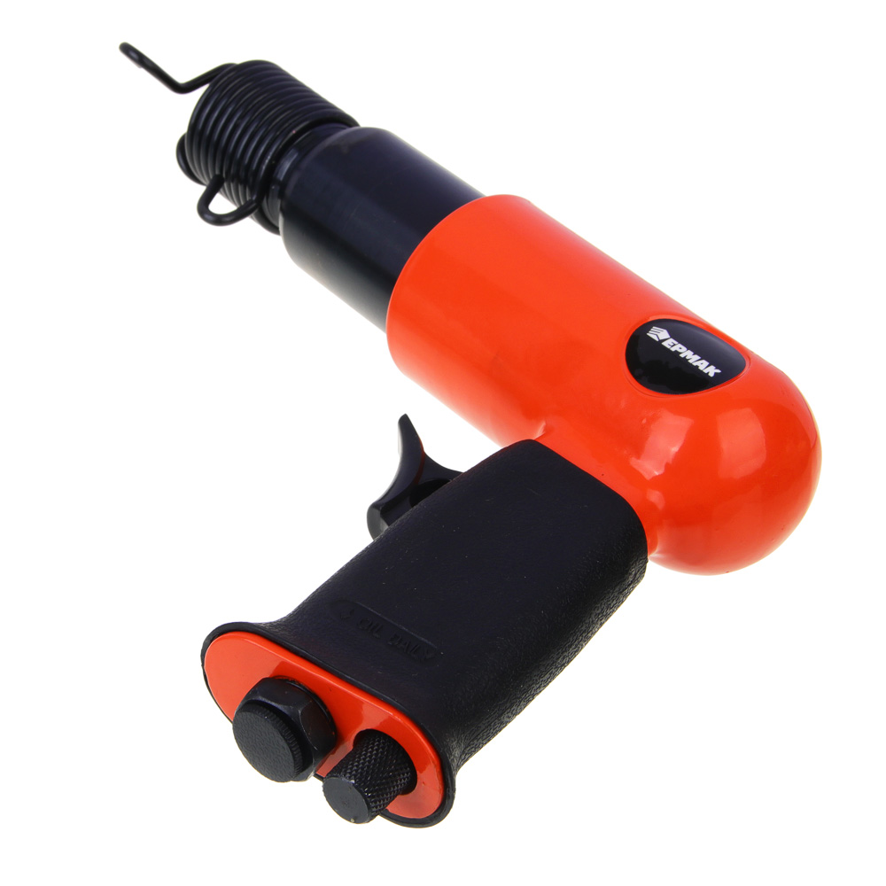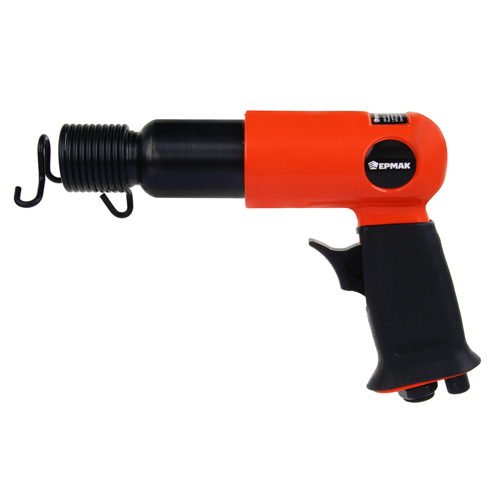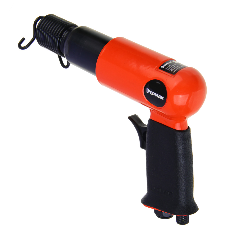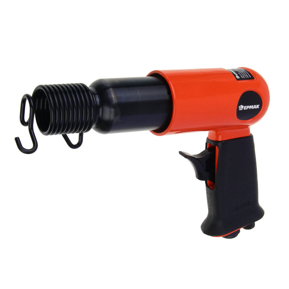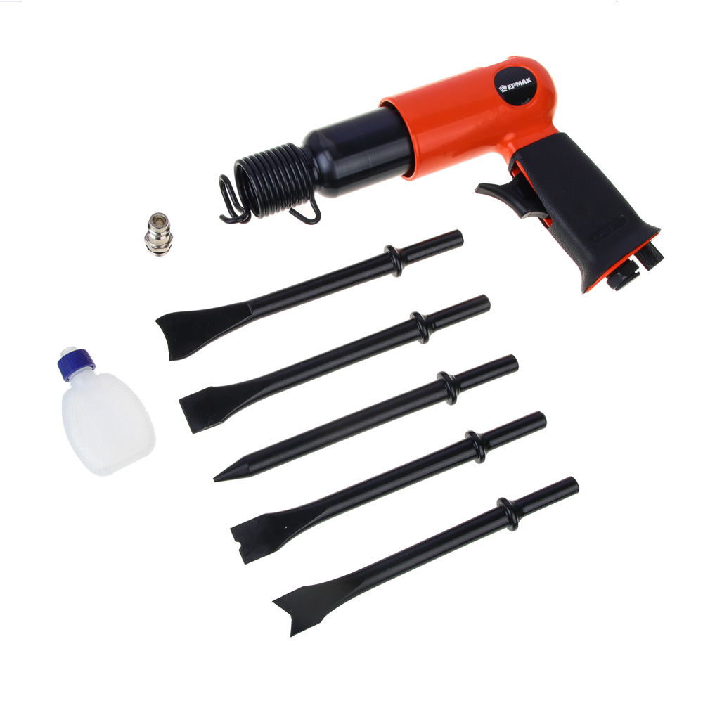 Пневматический молоток ЕРМАК с комплектом из 5 насадок. Предназначен для выполнения ударный, режущих и рубящих работ, например, удаления заклепок, снятия слоя старого покрытия или штробления. Корпус инструмента выполнен из легкого и прочного алюминиевого сплава, что облегчает работу оператора в процессе интенсивной эксплуатации инструмента. При длине 130 мм частота ударов молотка составляет 4500 уд/мин. Плавная кнопка пуска и удобная обрезиненная рукоять позволяют работнику вести работы долгое время не утомляясь.Характеристики:Частота удара 4500 уд/минРасход воздуха 80 л/минРабочее давление 6,3 барСила удара 5 Дж