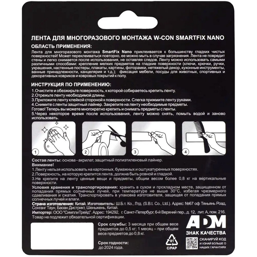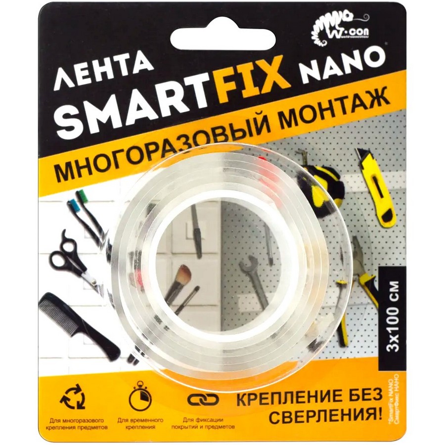 Лента для многоразового монтажа SmartFix служит для закрепления мелких (до 0,8 кг) предметов на вертикальных плоскостях или крупных объектов на полу. Приклеивается к большинству гладких поверхностей, не фиксируется на бумаге, картоне, штукатурке. Не оставляет следов, не повреждает стены, легко снимается, в случае загрязнения моется. Длина — 1 м, ширина — 3 см, прозрачная.