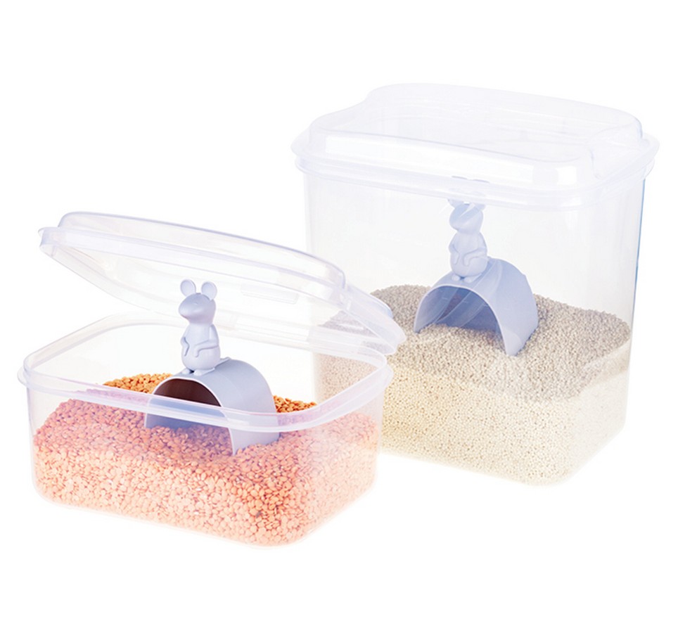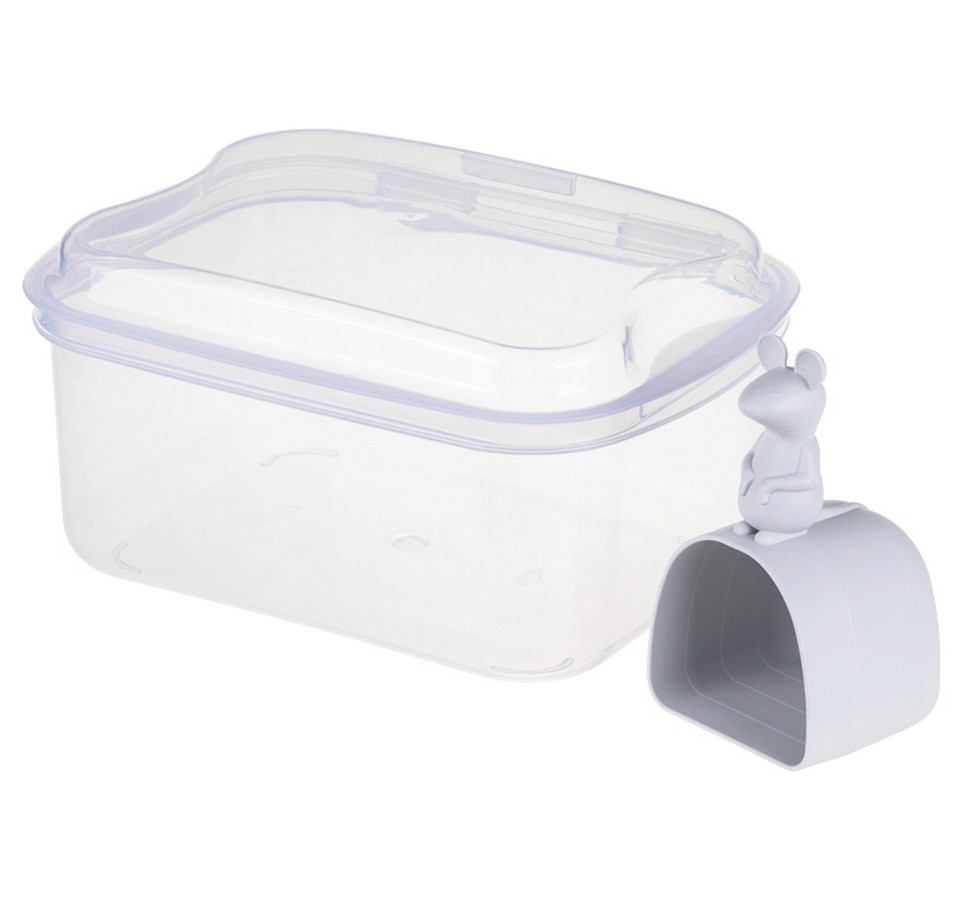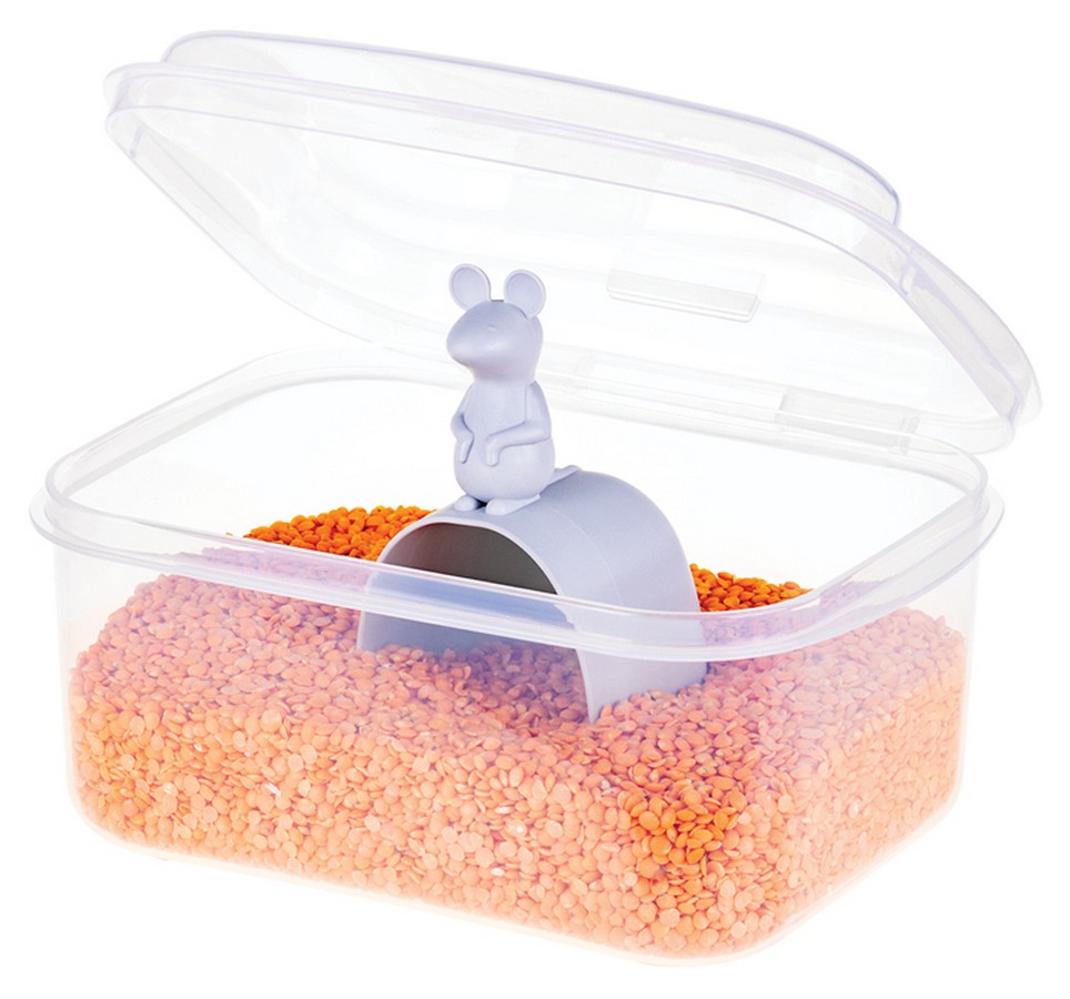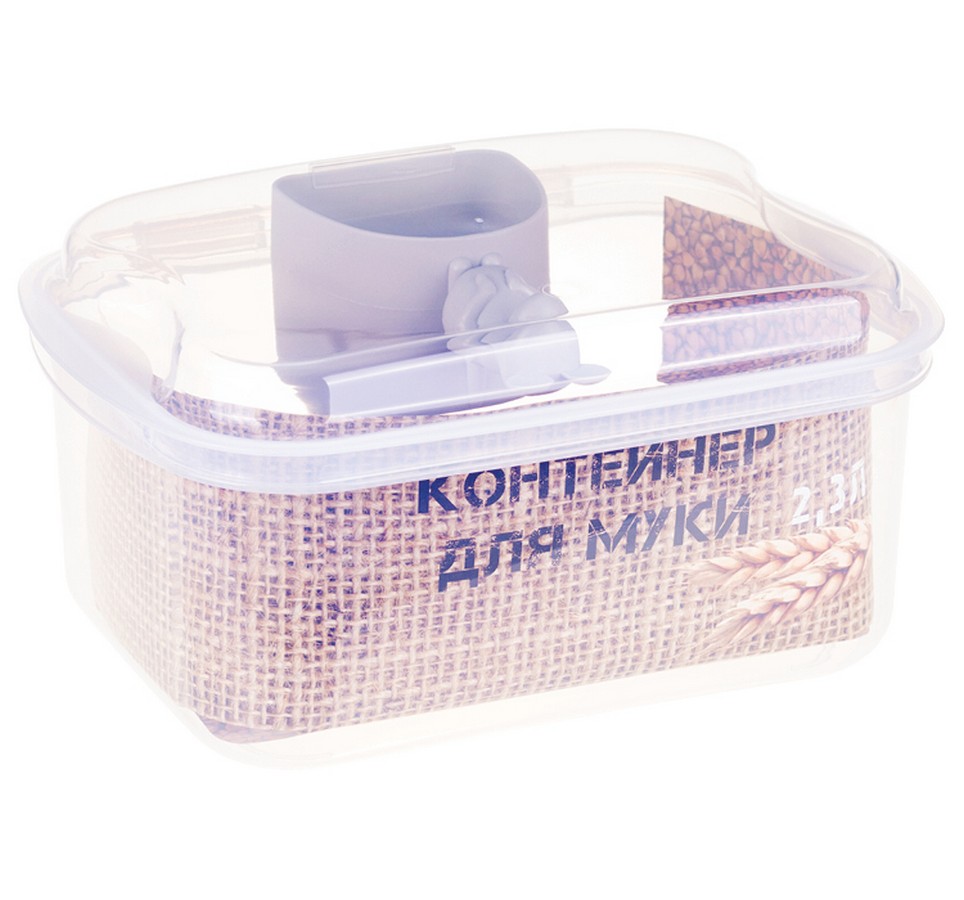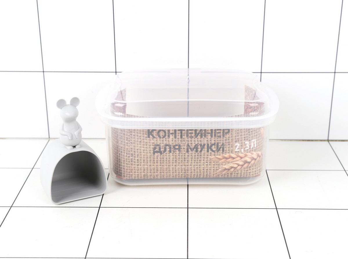 Контейнер для муки – отличная замена ненадёжным бумажным пакетам. Предназначен для организации хранения сыпучих продуктов на кухне и в ванной комнате. Крышка фиксируется и защищает содержимое от посторонних запахов и влаги. Прозрачный корпус позволяет следить за остатками продуктов. Контейнер с мерной ложкой оживит интерьер кухни и упростит множество кулинарных операций. Мерная ложка объёмом 180 мл станет незаменимым девайсом при приготовлении любимых блюд. Ручка у ложки выполнена в виде мышки.