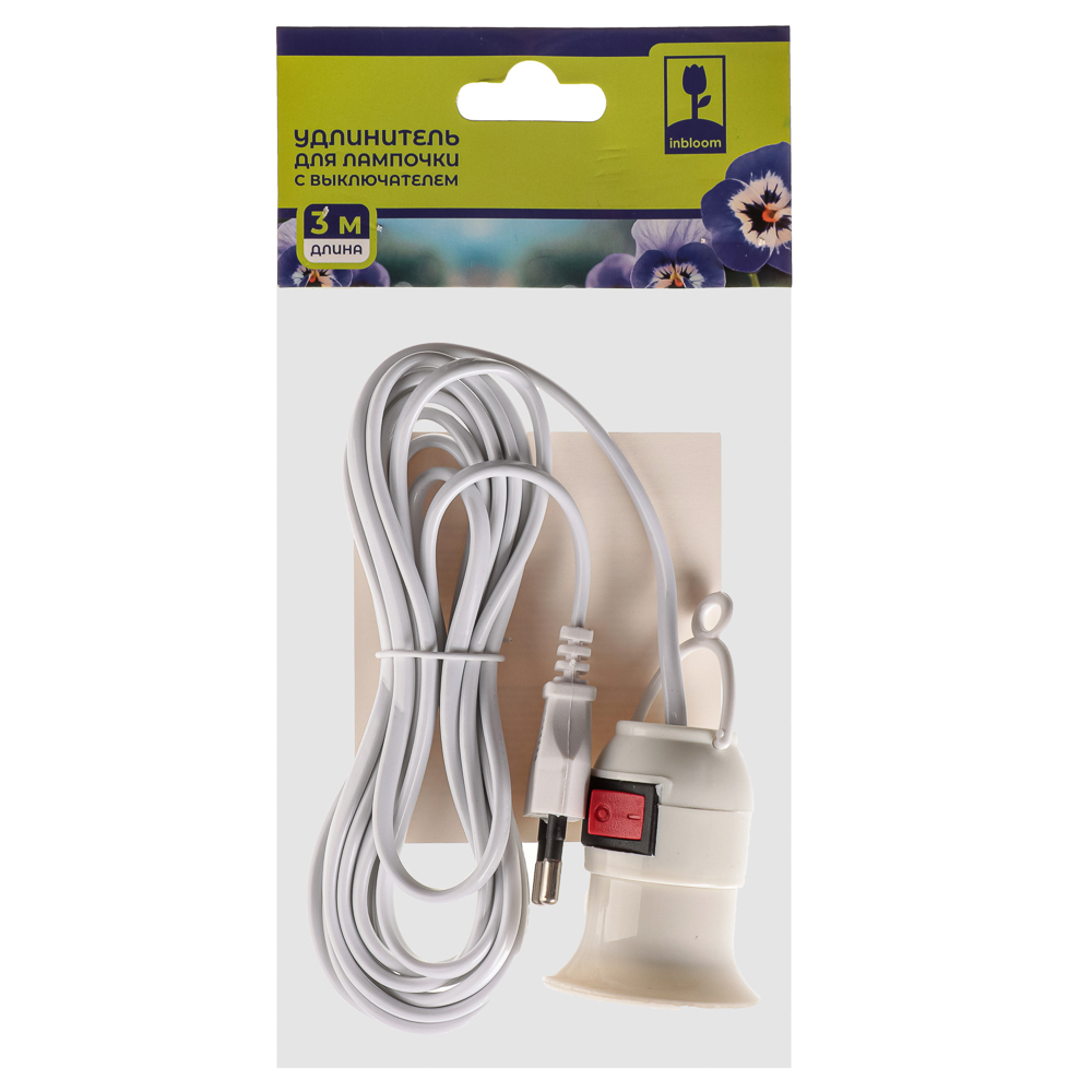 Удлинитель для лампочки с выключателем INBLOOM длиной 3 метра с типом цоколя E27 позволяет повесить лампочку в любом удобном месте. Используется в подсобных помещениях, а также для организации подсветки рассады, комнатных растений и микрозелени. Изготовлен из огнестойкого пластика с медными контактами. Тип крепления лампы – винтовой.