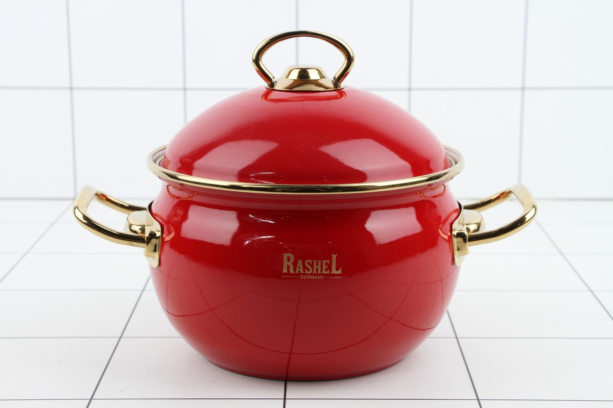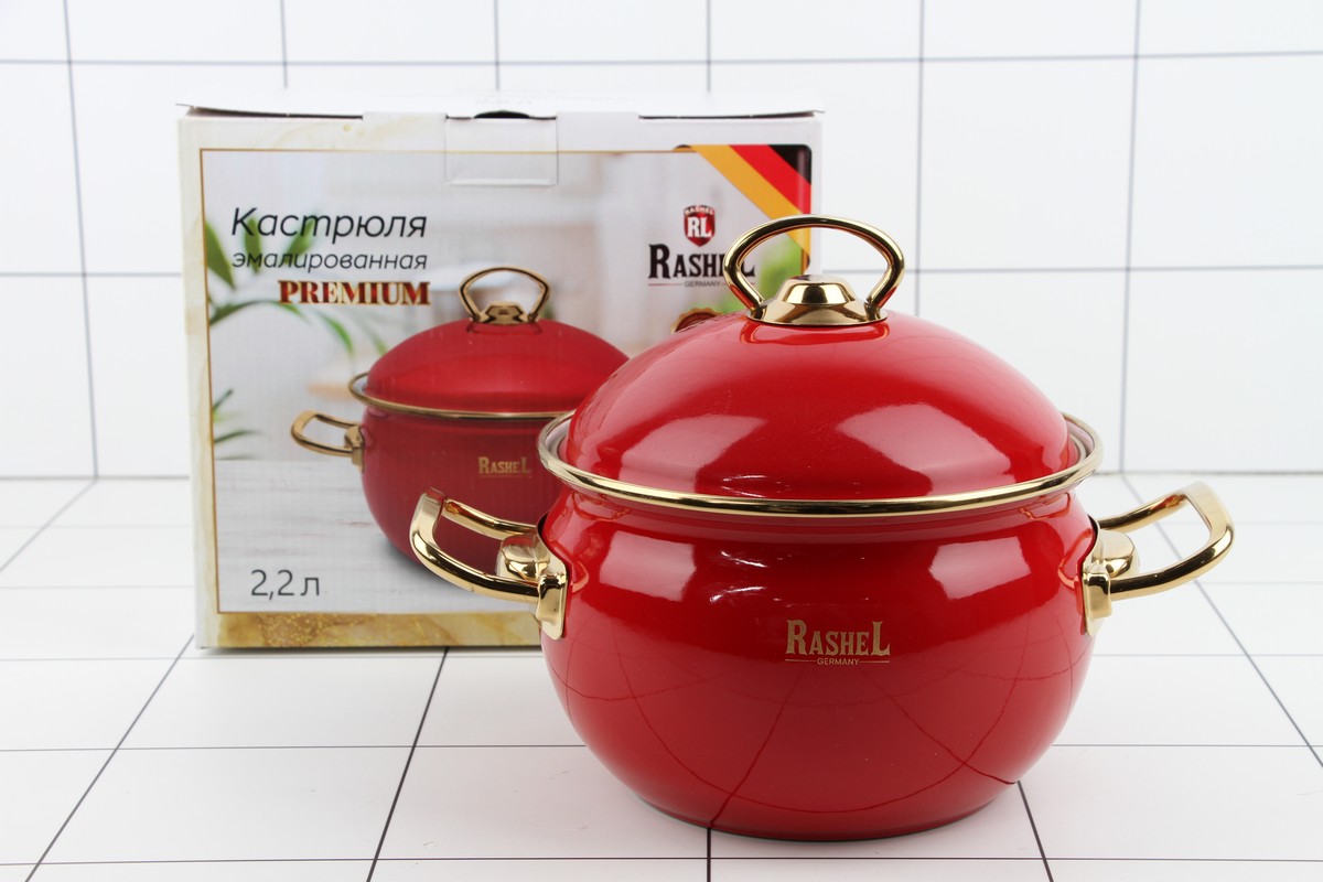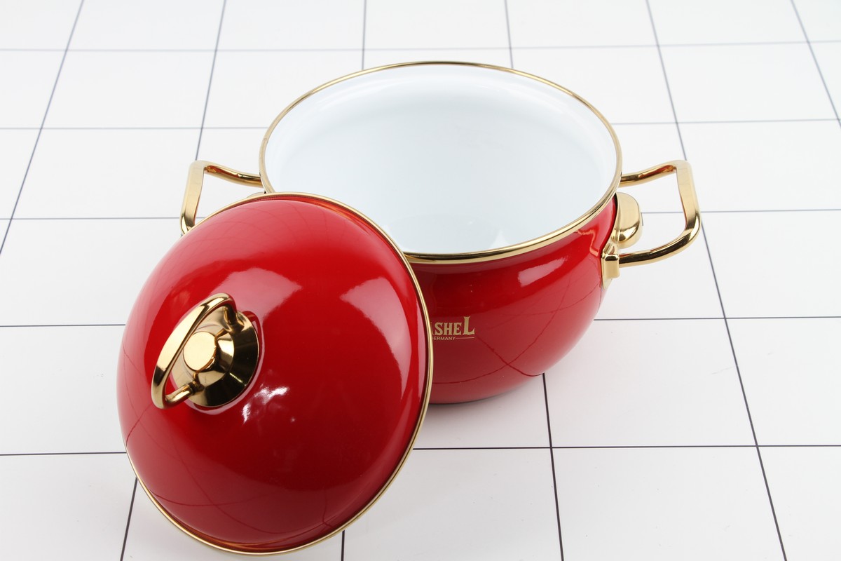Кастрюля 2,2л эмалированная (красная) эмал. кр.; ручки золото - Объём кастрюли 2,2 л, d=16 см; - Ручки из нержавеющей стали 18/10; - Стальная эмалированная крышка; - Наружное и внутреннее трёхслойное глянцевое эмалированное покрытие; - Индивидуальная подарочная упаковка; - Подходит для всех видов плит, включая индукционные.