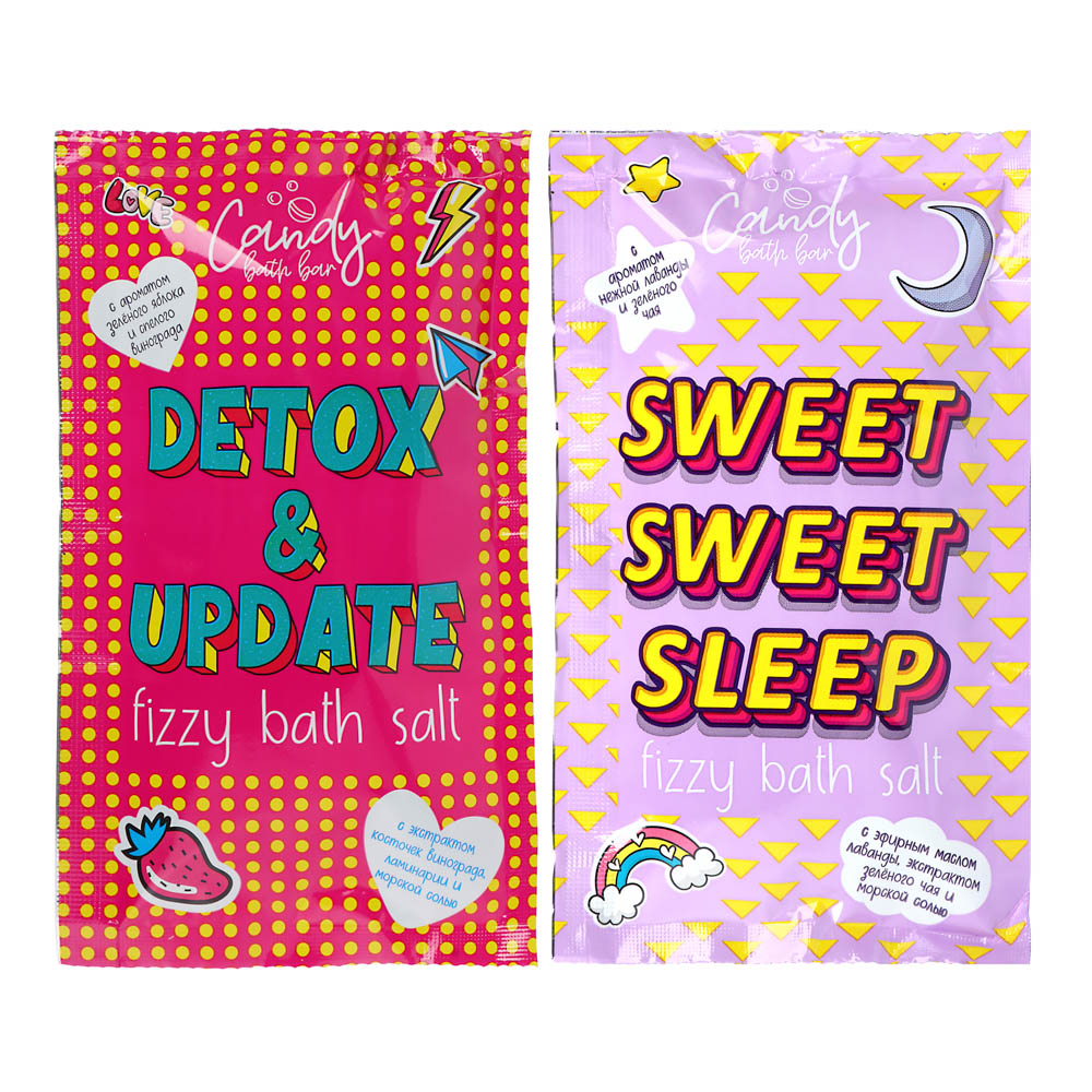 Массу позитивных эмоций подарит вам соль для ванн серии Candy bath bar в двух ароматах "Detox & Update"/"Sweet Sweet Sleep" . После добавления соли вода приобретает роскошный цвет с перламутровыми переливами, не окрашивая при этом ванну и кожу. Морская соль очищает кожу, выводит токсины и обогащает ее полезными микроэлементами. Вам просто не захочется выходить из ванны!