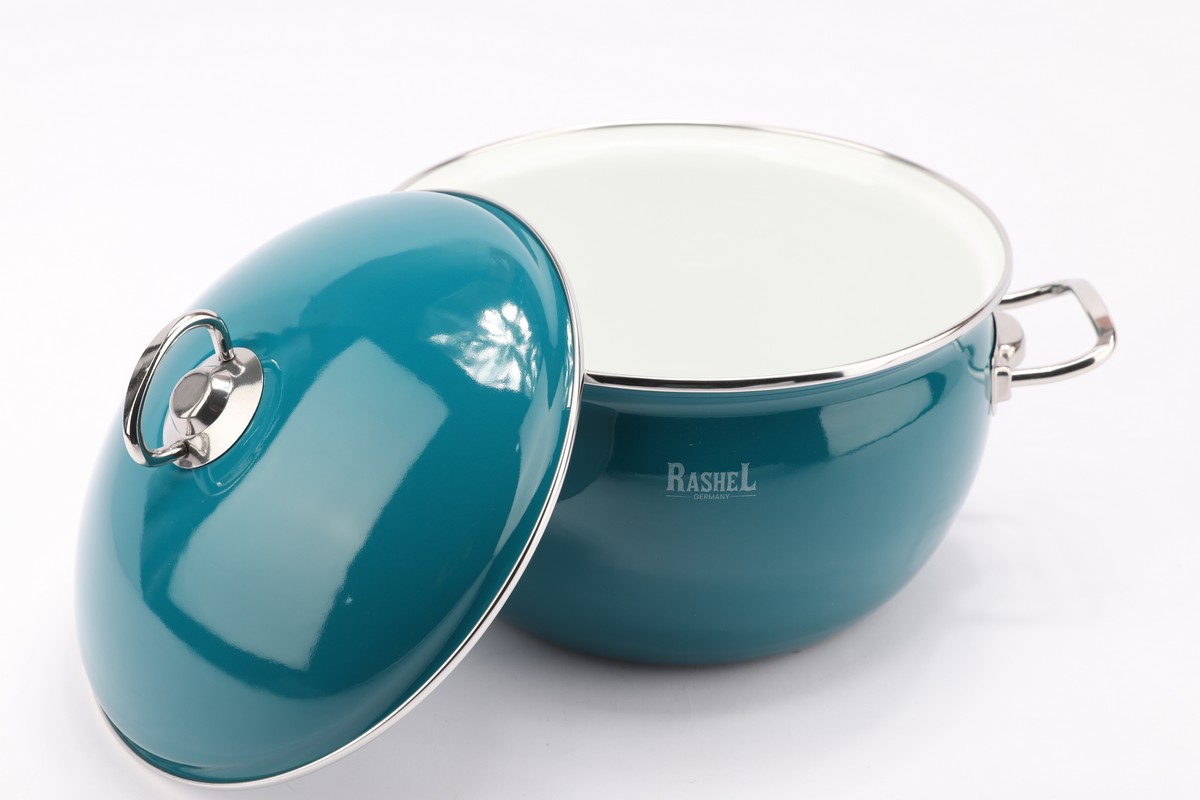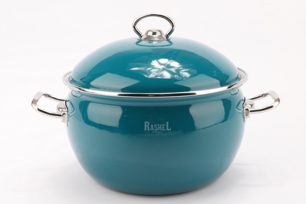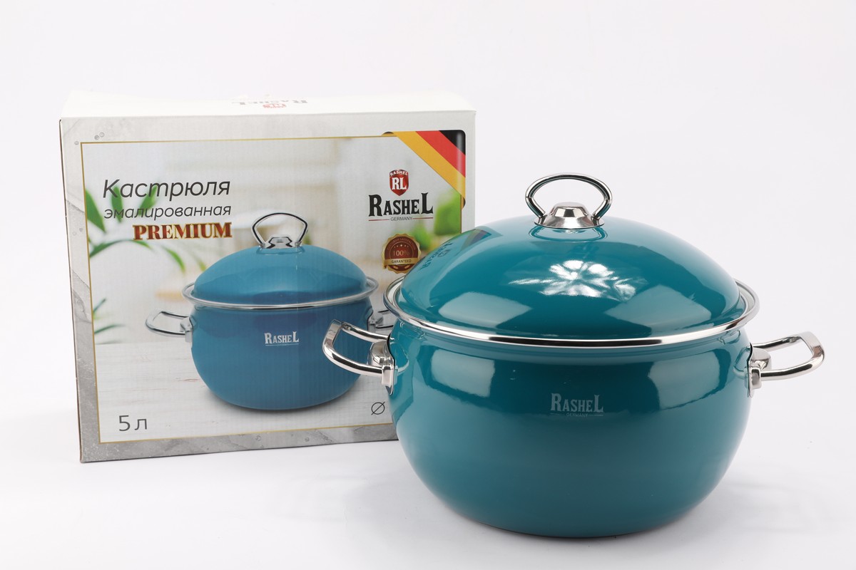 Кастрюля 5л эмалированная (бирюзовая) эмал. кр.; ручки хром - Объём кастрюли 5л, d=22 см; - Ручки из нержавеющей стали 18/10; - Стальная эмалированная крышка; - Наружное и внутреннее трёхслойное глянцевое эмалированное покрытие; - Индивидуальная подарочная упаковка; - Подходит для всех видов плит, включая индукционные.