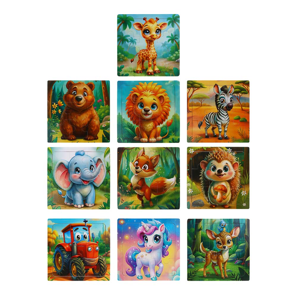 Пазлы для малышей – увлекательная настольная игра для девочек и мальчиков, развивающая математический склад ума. На пазле нарисована красочная иллюстрация на 9 деталях. В процессе игры ребёнок развивает мелкую моторику, зрительное и тактильное восприятие, использует логическое мышление. Материал изготовления головоломки полностью безопасен даже для самых маленьких. Игра учит находить нужный элемент из множества похожих и располагать его в правильном месте. Сначала можно собрать пазлы вместе с ребенком, рассказать про каждое животное и их особенности, а потом предложить малышу самостоятельно собрать пазлы. Размер игры 15х15см.