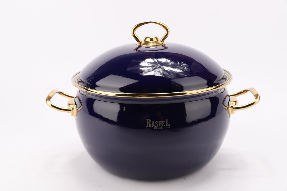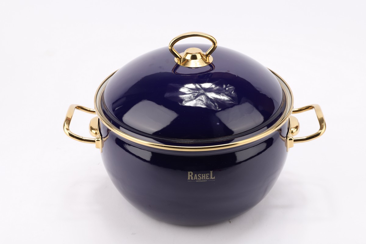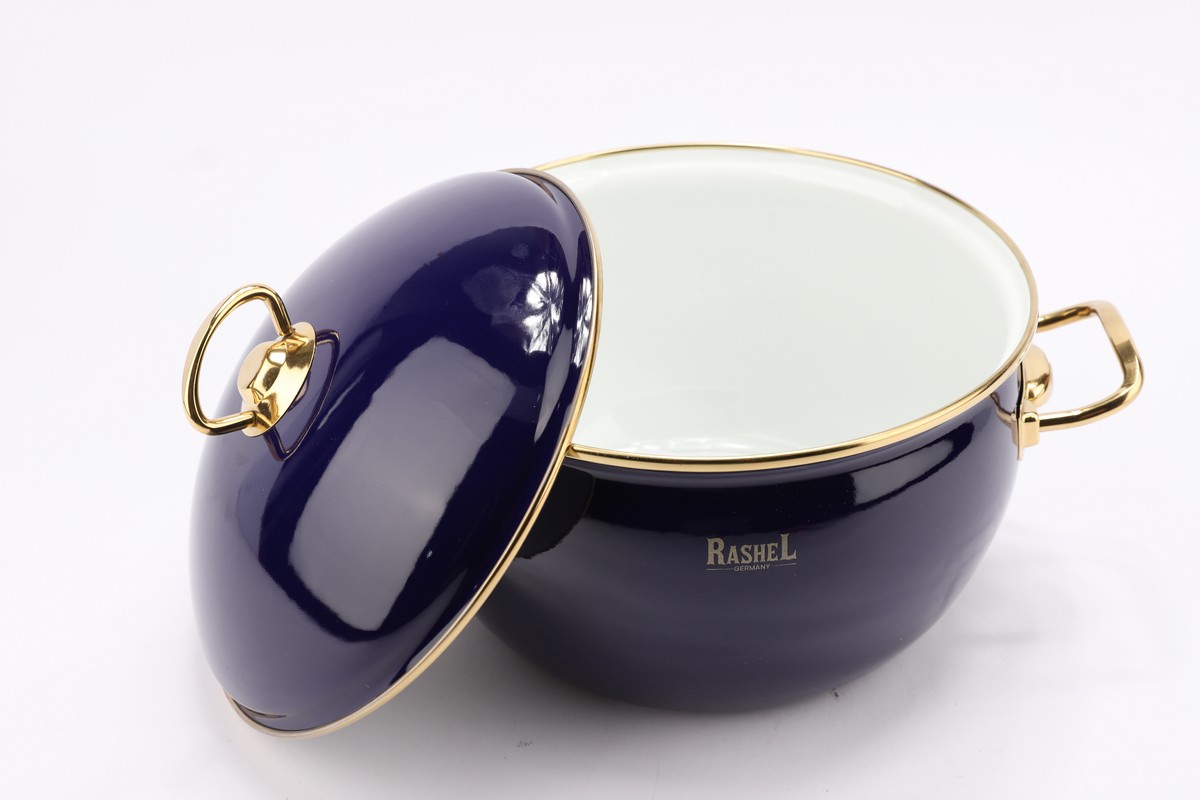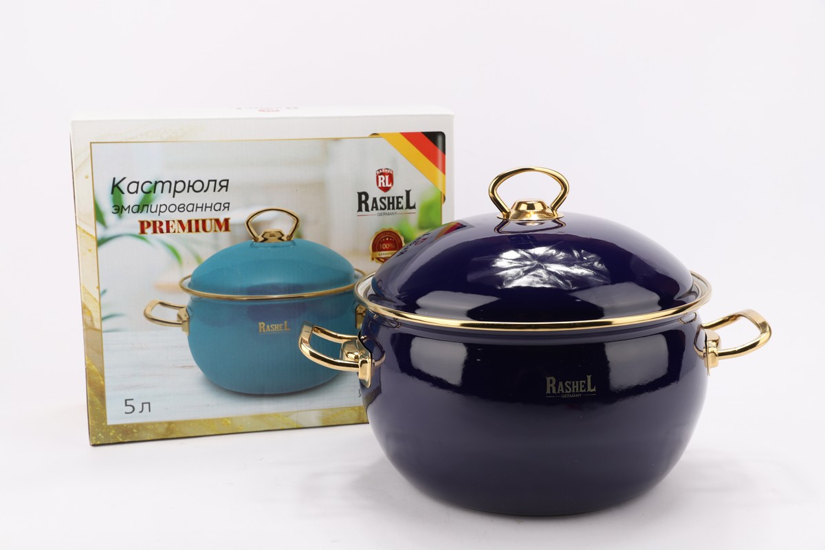 Кастрюля 5л эмалированная (синяя) эмал. кр.; ручки золото - Объём кастрюли 5л, d=22 см; - Ручки из нержавеющей стали 18/10; - Стальная эмалированная крышка; - Наружное и внутреннее трёхслойное глянцевое эмалированное покрытие; - Индивидуальная подарочная упаковка; - Подходит для всех видов плит, включая индукционные.