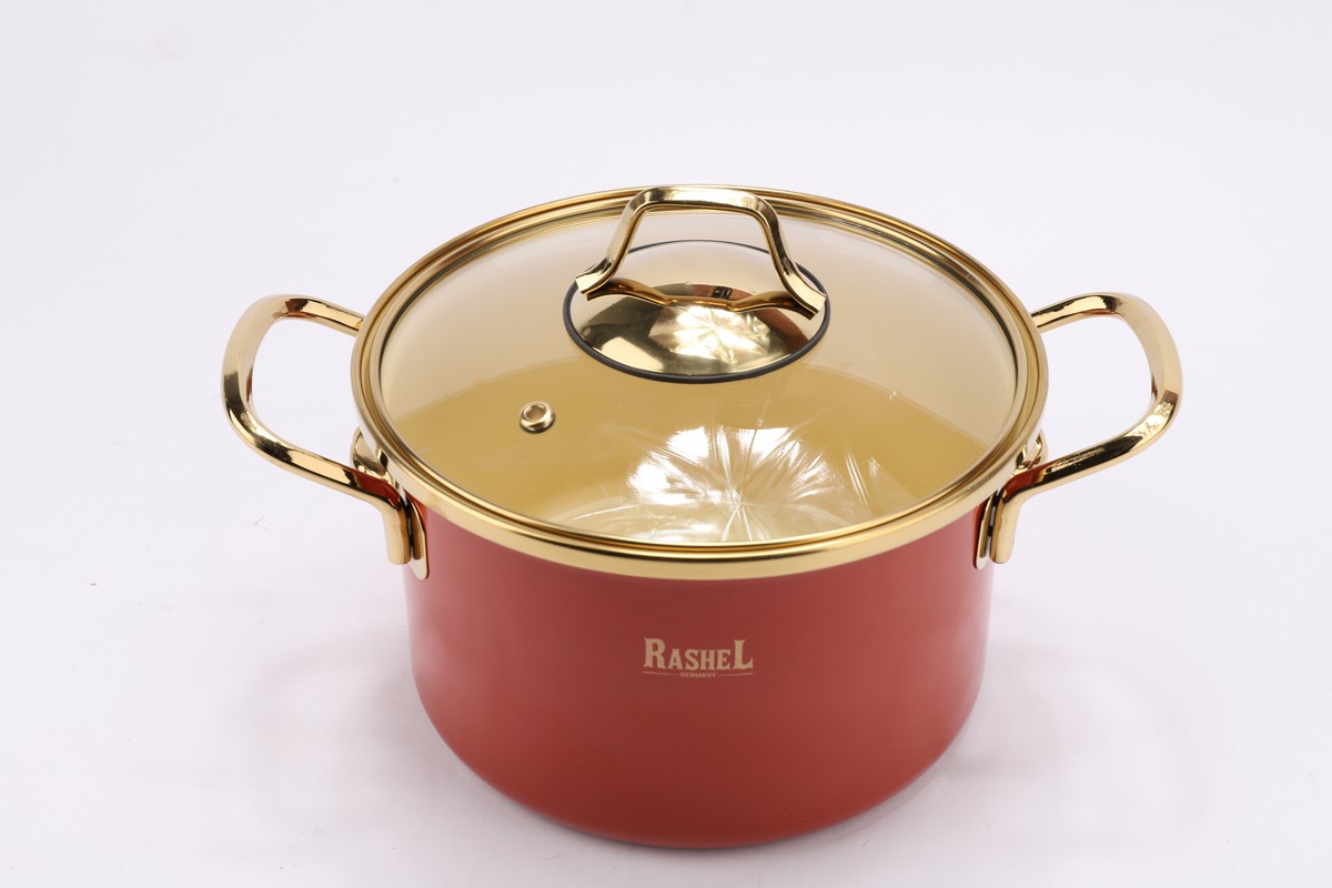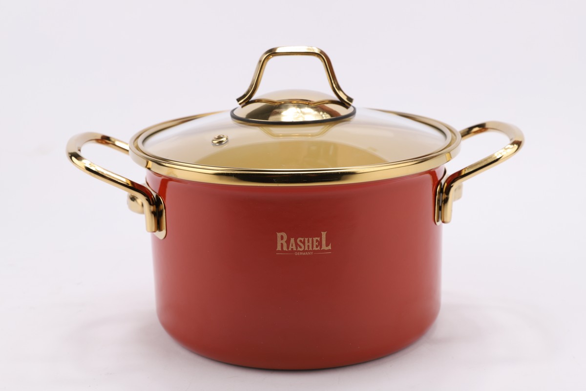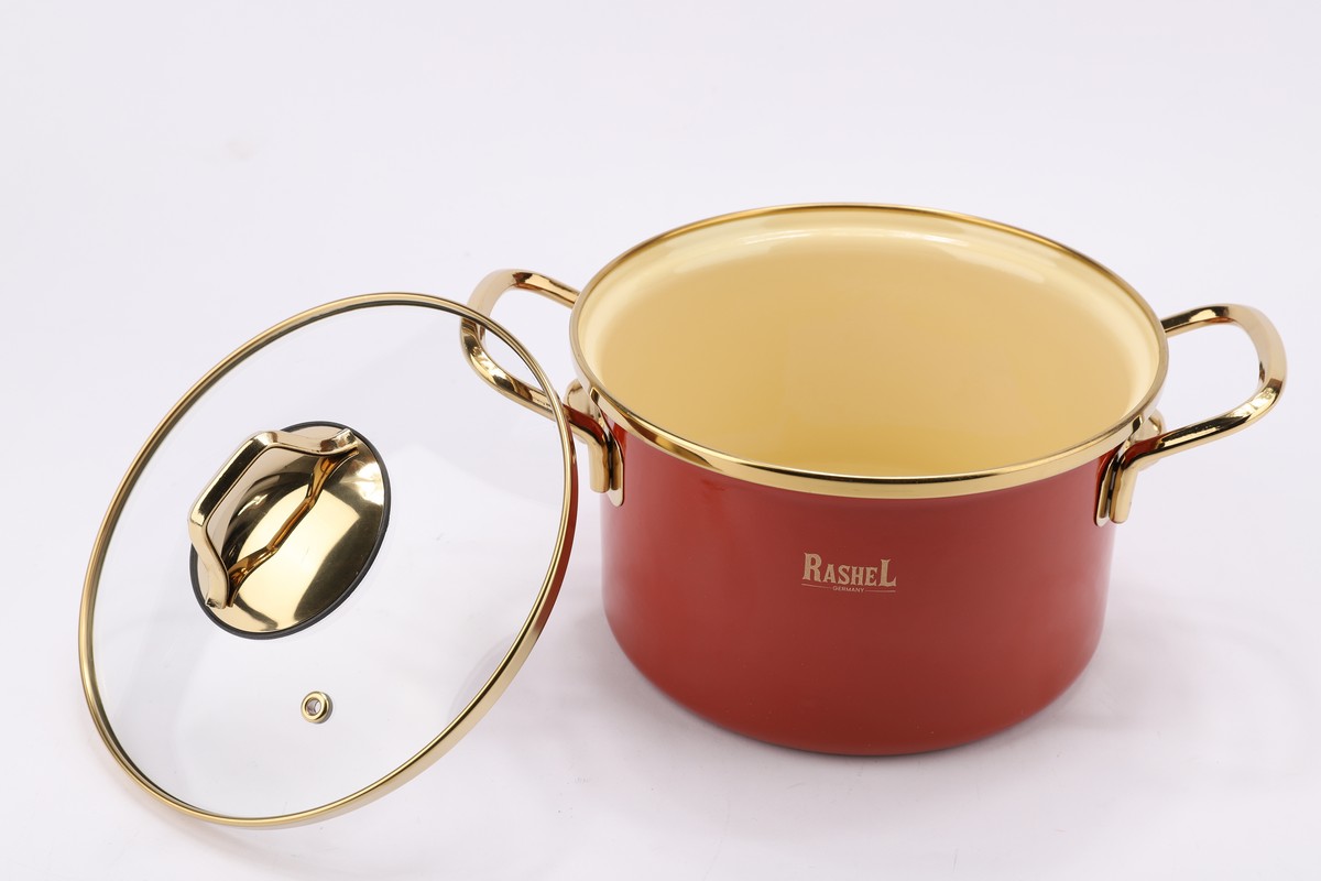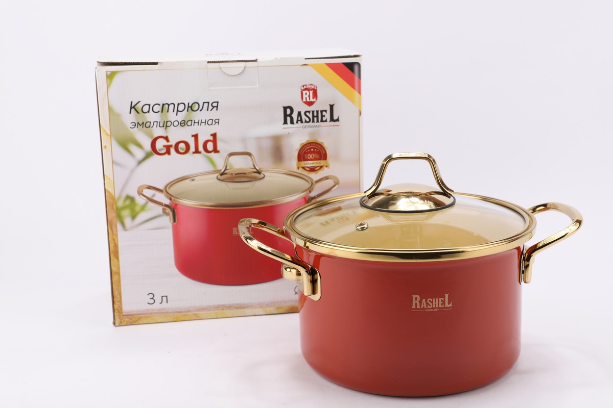 Кастрюля 3 л эмалированная со стекл. кр., ручка золото; цвет:оранжевый - Объём кастрюли 3л, d=18 см; - Толщина стенки 1,5 мм; - Трехгранные ручки из нержавеющей стали 18/10 покрытые золотом; - Стеклянная крышка; - Наружное и внутреннее трёхслойное глянцевое эмалированное покрытие; - Внутреннее кремовое эмалированное покрытие; - Индивидуальная подарочная упаковка; - Подходит для всех видов плит, включая индукционные.