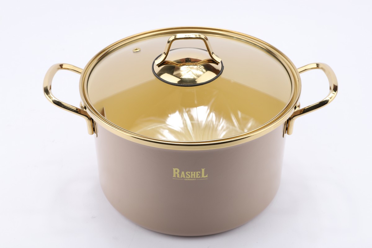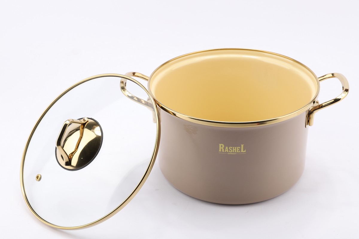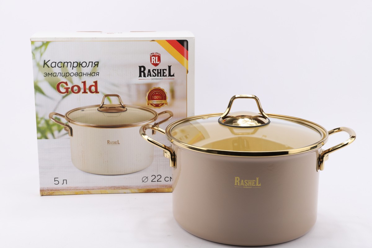 Кастрюля 5 л эмалированная со стекл. кр., ручка золото; цвет:кремово-розовый - Объём кастрюли 5л, d=22 см; - Толщина стенки 1,5 мм; - Трехгранные ручки из нержавеющей стали 18/10 покрытые золотом; - Стеклянная крышка; - Наружное и внутреннее трёхслойное глянцевое эмалированное покрытие; - Внутреннее кремовое эмалированное покрытие; - Индивидуальная подарочная упаковка; - Подходит для всех видов плит, включая индукционные.