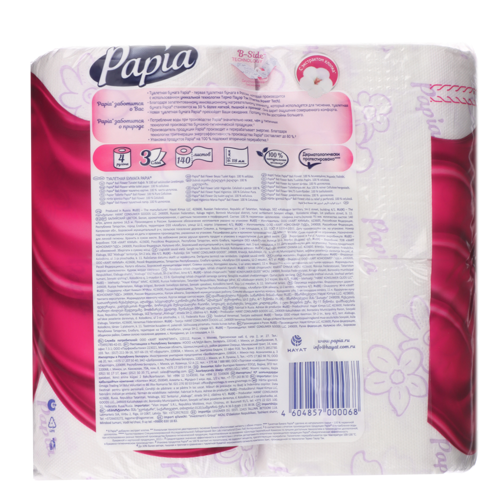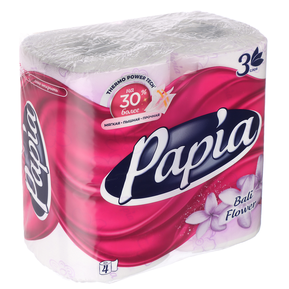 Белая трёхслойная туалетная бумага PAPIA балийский цветок в рулонах. Нежная текстура с инновационным тиснением и декоративный рисунок придают бумаге особую мягкость и обеспечивают бережный уход за кожей.
