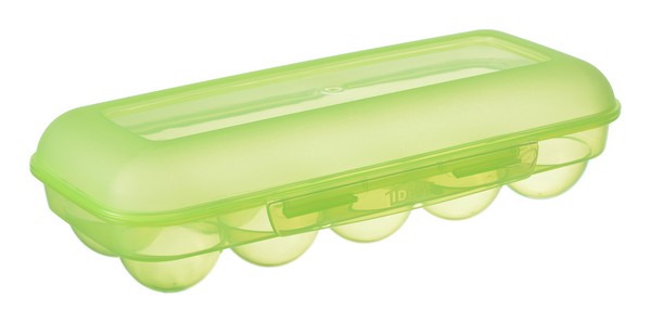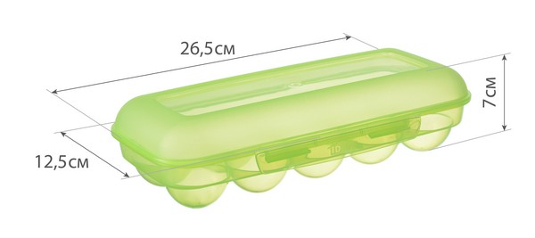 Габариты: 170x70x115 мм Контейнер для хранения яиц на десять штук прекрасно подойдёт для организации пространства в Вашем холодильнике, переноски и сохранности яиц. Надёжный защёлкивающийся замок предотвратит случайное раскрытие контейнера. Размер предусматривает его хранение на дверце холодильника. Также несколько контейнеров можно ставить друг на друга.