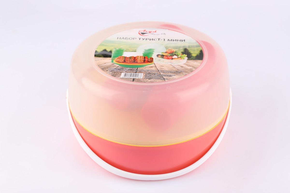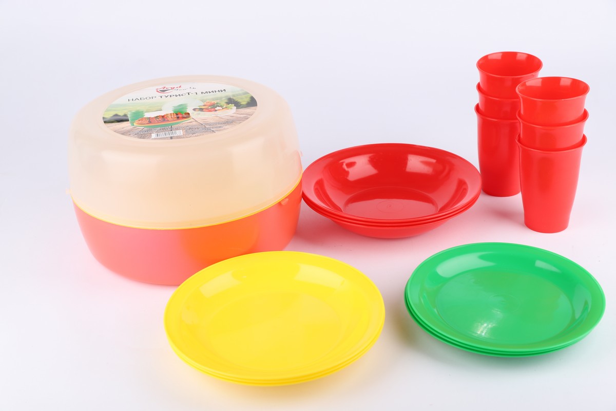 Набор посуды Турист-1: полукорпус с ручкой, объем 3л. - 2шт., доска разделочная - 1шт., набор посуды - тарелка для первых блюд - 3шт., тарелка для вторых блюд - 3шт., тарелка салатная - 3шт., стакан 0,35л. - 6шт.