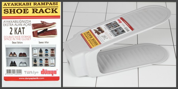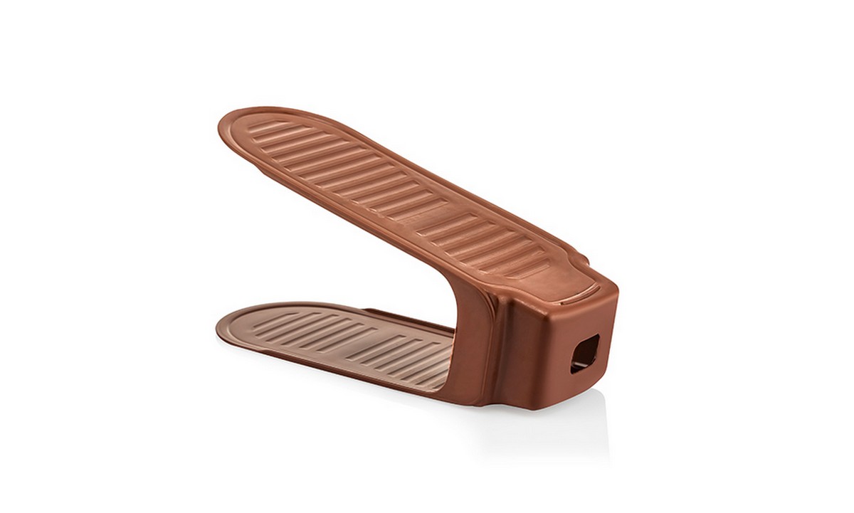 Двойные подставки для обуви регулируются по высоте, что позволяет поставить на них различную обувь, начиная с тапочек и заканчивая ботинками и обуви на высоком каблуке. Размеры: длина - 300 мм, ширина - 110 мм, высота - 75 мм/180 мм.
