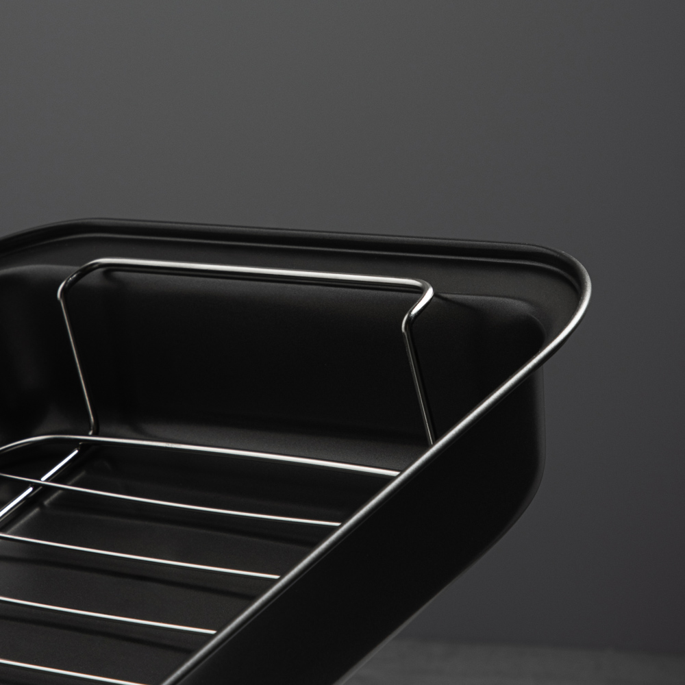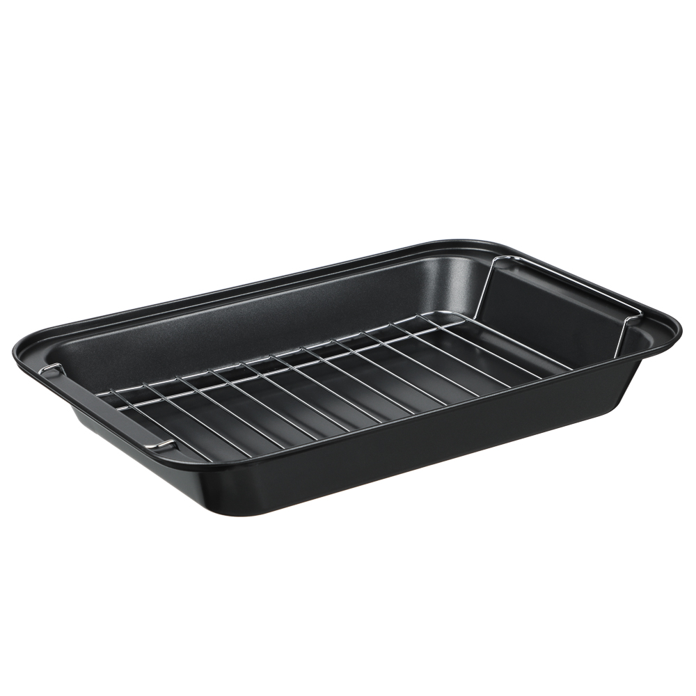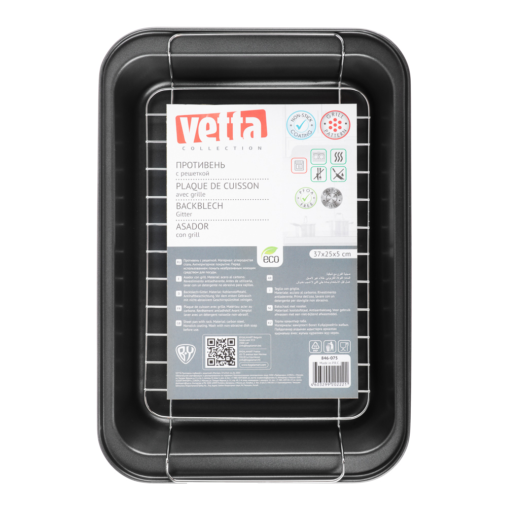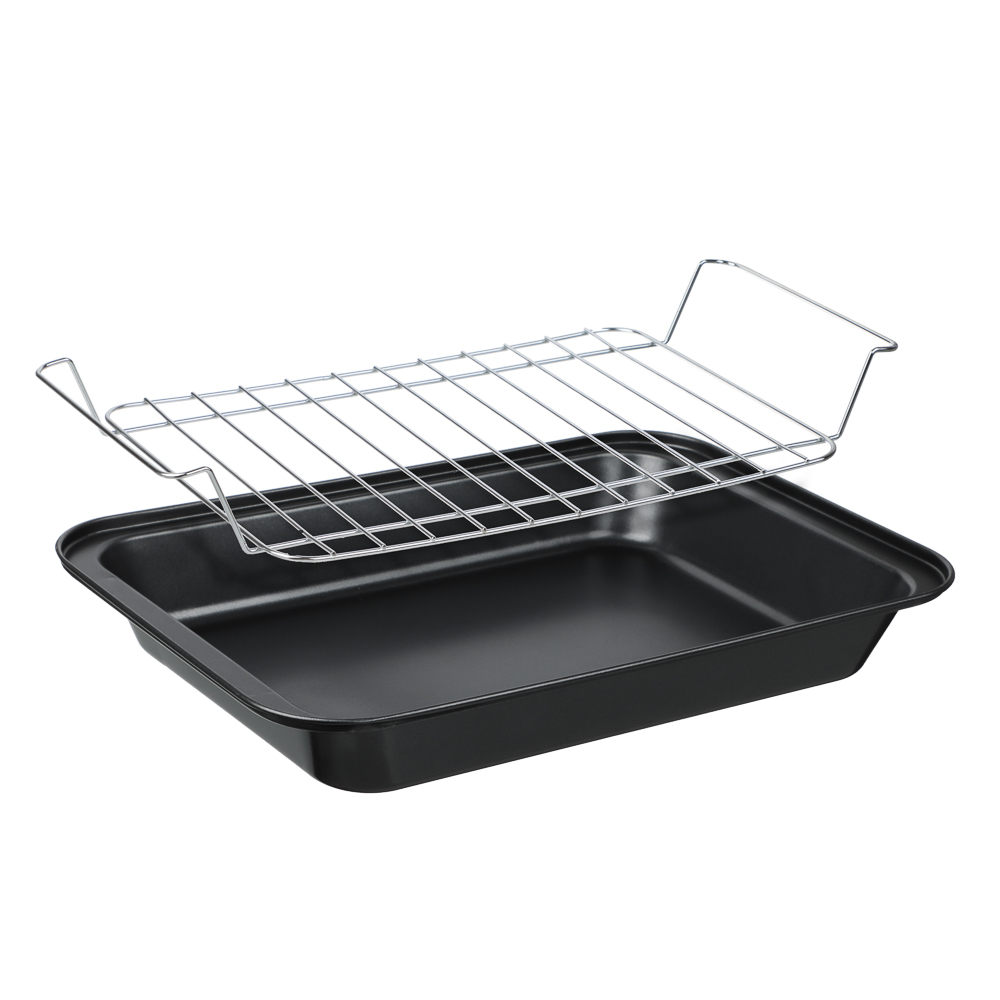 Готовьте аппетитные блюда-гриль прямо в вашей духовке! Глубокий противень с решеткой VETTA Ростер позволяет готовить максимально полезные блюда с красивыми полосками-гриль. Изделие из углеродистой стали имеет безопасное антипригарное покрытие и легко моется. Для приготовления диетических блюд уложите мясо и овощи на решетку и запекайте до готовности. Лишний жир останется под решеткой на дне противня. Противень Ростер – радость для каждой хозяйки!