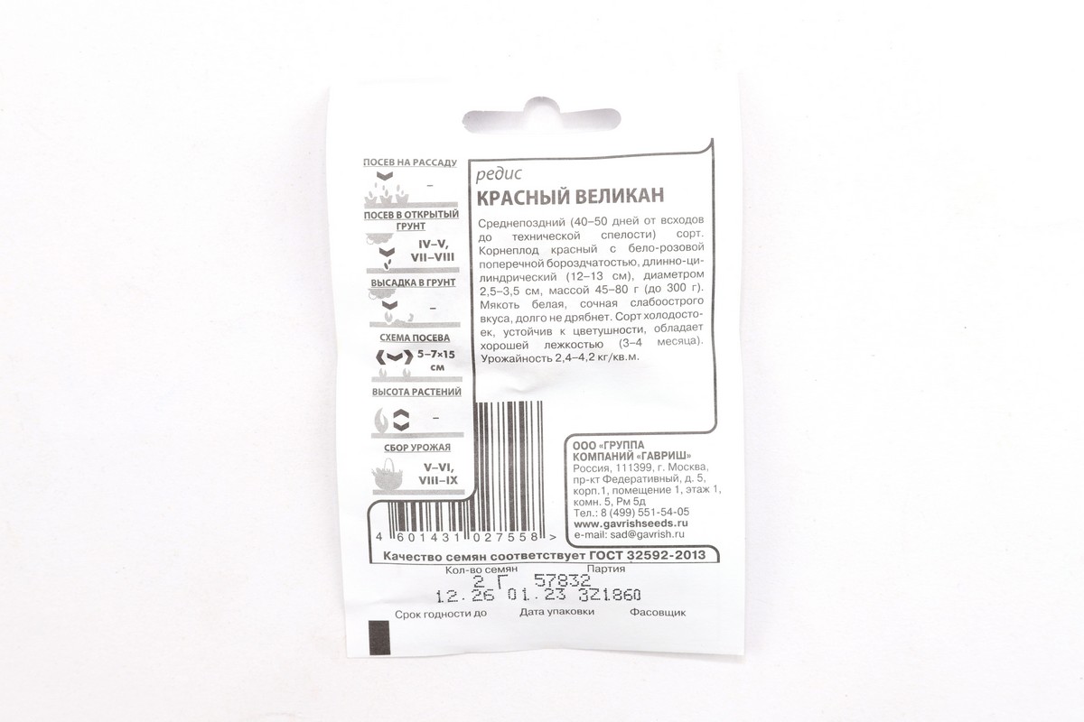 Позднеспелый (40-50 дней от всходов до технической спелости) сорт. Корнеплод красный с бело-розовой поперечной бороздчатостью, длинно-цилиндрический, длиной 12-13 см, диаметром 2,5-3,5 см, массой до 300 г. Мякоть белая, сочная слабо-острого вкуса, долго не дрябнет. Корнеплоды слегка приподняты над поверхностью почвы. Вкус отличный. Сорт холодостоек, устойчив к цветушности, обладает хорошей лежкостью (3-4 месяца). Выращивают посевом в открытый грунт на глубину 1 см по схеме 5-7x15 см. Урожайность 2,4-4,2 кг/м2.