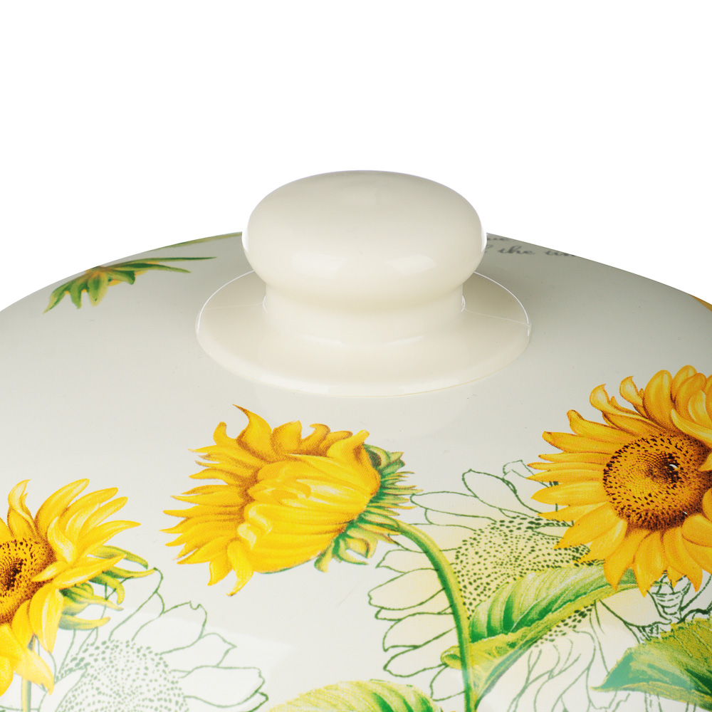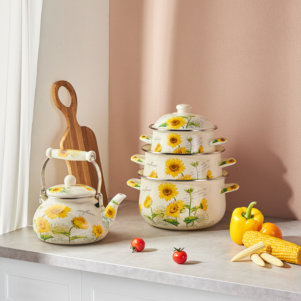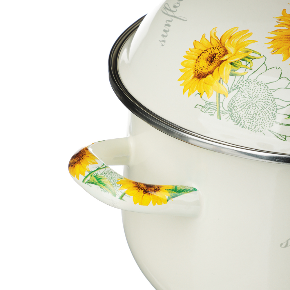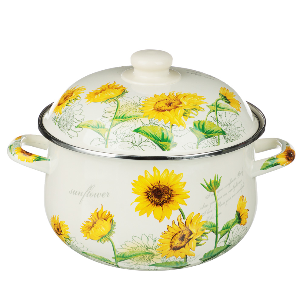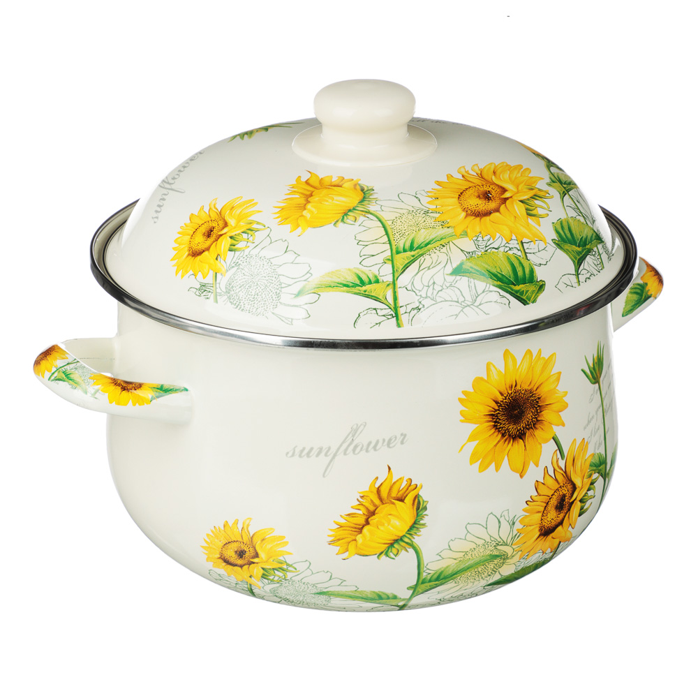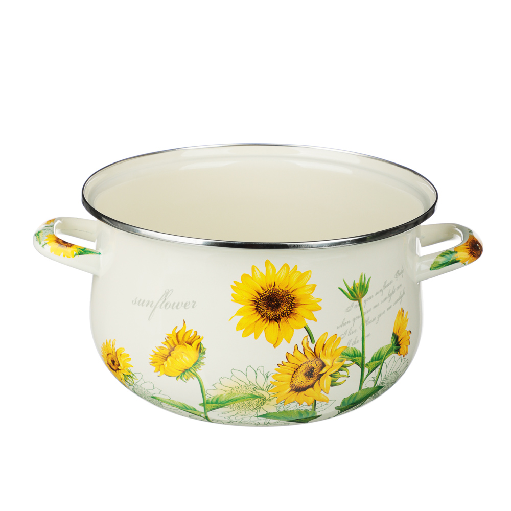 Нужна безопасная, качественная и красивая посуда для кухни? Эмалированная кастрюля VETTA «Подсолнухи» отвечает всем заявленным критериям. Идеально гладкая поверхность легко очищается от загрязнений, исключает размножение бактерий. В такой емкости можно хранить первые и вторые блюда. Приготовленный суп не пропитается запахом металла и не испортится.Причины купить эмалированные кастрюли VETTA:• варите на всех типах плит, включая индукцию;• объем — 3,6 литра, диаметр — 22 см;• можно ставить в духовой шкаф при температуре до 200°С;• эмалированная посуда практична и долговечна: не подвержена коррозии, прочная, не деформируется со временем.