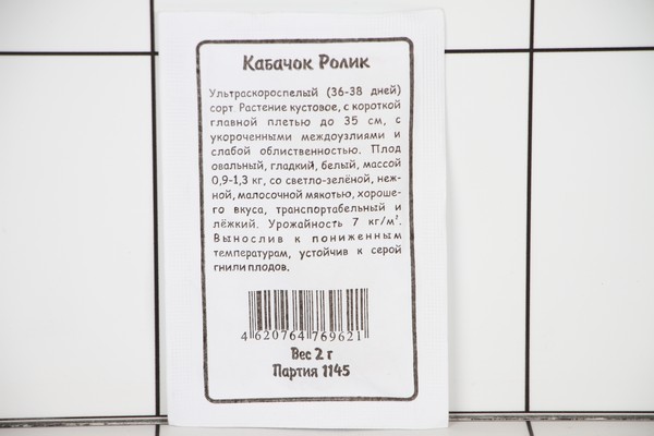 Сорт ультраскороспелый. Растение кустовое, облиственность слабая. Плод овальный, гладкий, белый. Устойчив к пониженным температурам. Урожайность высокая, транспортабельность хорошая. Серой гнилью не поражается. Идеально подходит на хранение. Районирован повсеместно. Посев семян производят в конце мая - начале июня после того, как минуют весенние заморозки. Семена высевают в лунки по 2-3 шт. Расстояние между лунками не менее 60 см. После появления всходов слабые растения аккуратно удаляют. Дальнейший уход заключается в регулярном поливе, рыхлении, окучивании и подкормках. Уборку плодов производят регулярно с интервалом 2-3 дня, не допуская их перезревания.