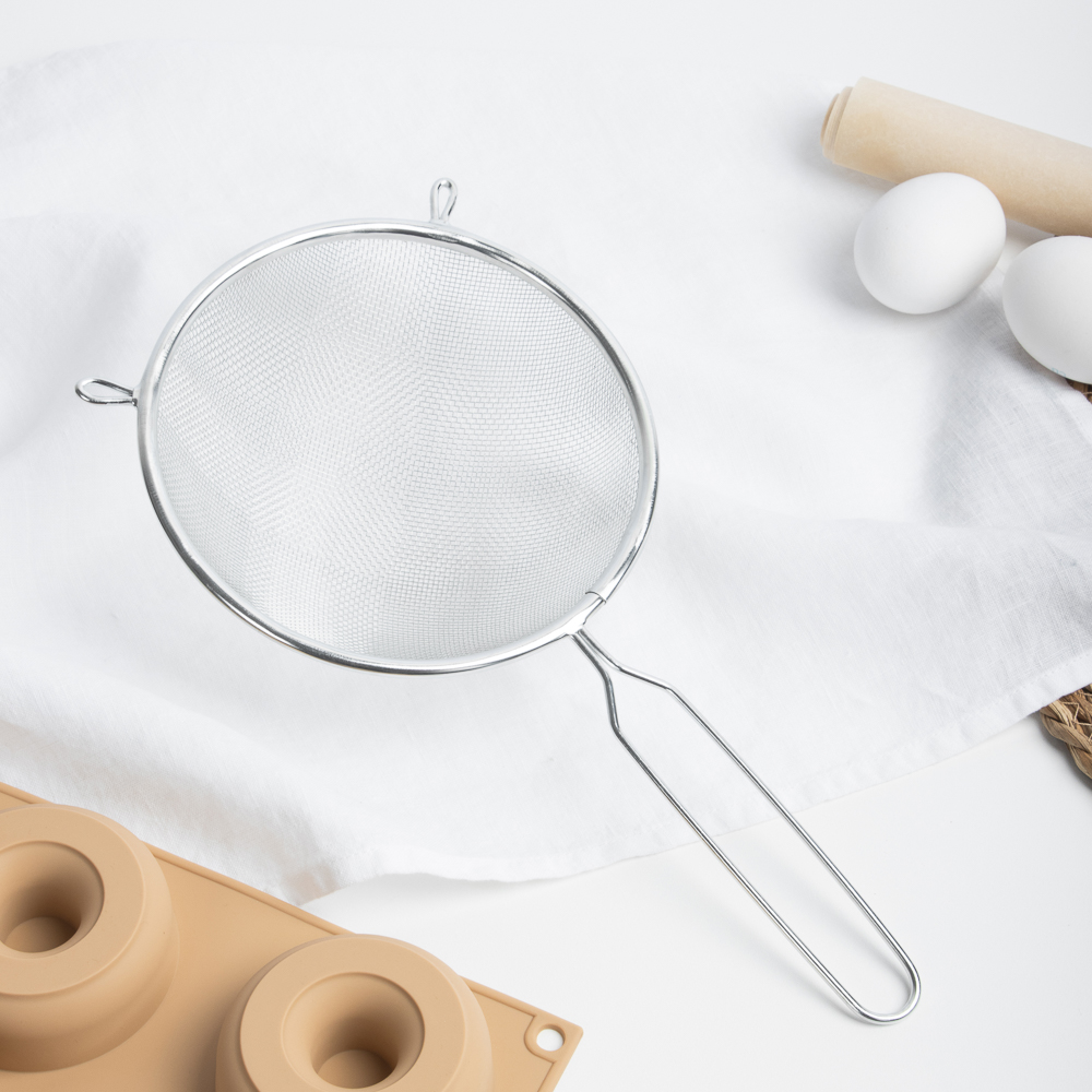 Cито с ободом и ручкой идеально подходит для просеивания муки, сахарной пудры, какао и других сыпучих продуктов. Изготовлено из прочной нержавеющей стали. Обод сита предотвращает просыпание продуктов, а удобная ручка позволяет легко переносить сито во время использования. Диаметр сита составляет 16 см, что позволяет обрабатывать большие объемы продуктов. Это незаменимый инструмент для любого кулинара, пекаря или кондитера.