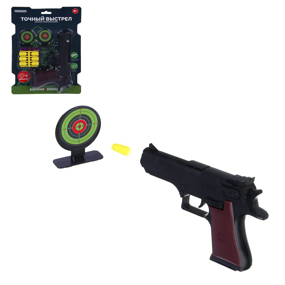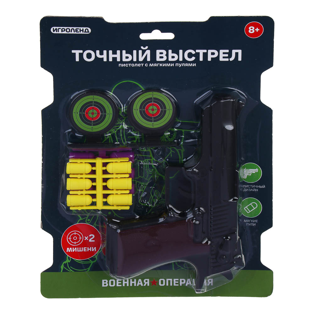 Игровой набор ИГРОЛЕНД «Точный выстрел» из 9 предметов – это игрушечный пистолет, две мишени и набор из 6 мягких пуль. Набор станет приятным подарком для мальчика, а также послужит отличным способом тренировки меткости и координации. Пистолет с мягкими пулями безопасен для ребенка и окружающих при правильном использовании. Устройте соревнования с друзьями и определите, кто из вас самый меткий. Набор предназначен для детей старше 8 лет.