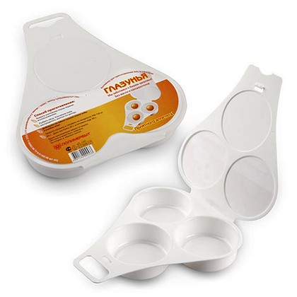 Контейнер для приготовления яиц в СВЧ «Глазунья» (для 3-х яиц) Раньше никто не мог и подумать, что такое будет возможно – приготовление яичницы-глазуньи в микроволновой печи. Теперь это стало возможно, приготовления яичницы из 3 яиц в СВЧ. Достоинства таких контейнеров неоспоримы – в них просто готовить, их легко мыть и сушить, они не занимают много места и всегда готовы порадовать вас вкусным питательным завтраком. Контейнеры для приготовления яичницы в СВЧ помогают экономить ваше время! Размер: 16 см х 2,5 см х 18,5 см. Диаметр отделения: 7 см. Материал: пластик.