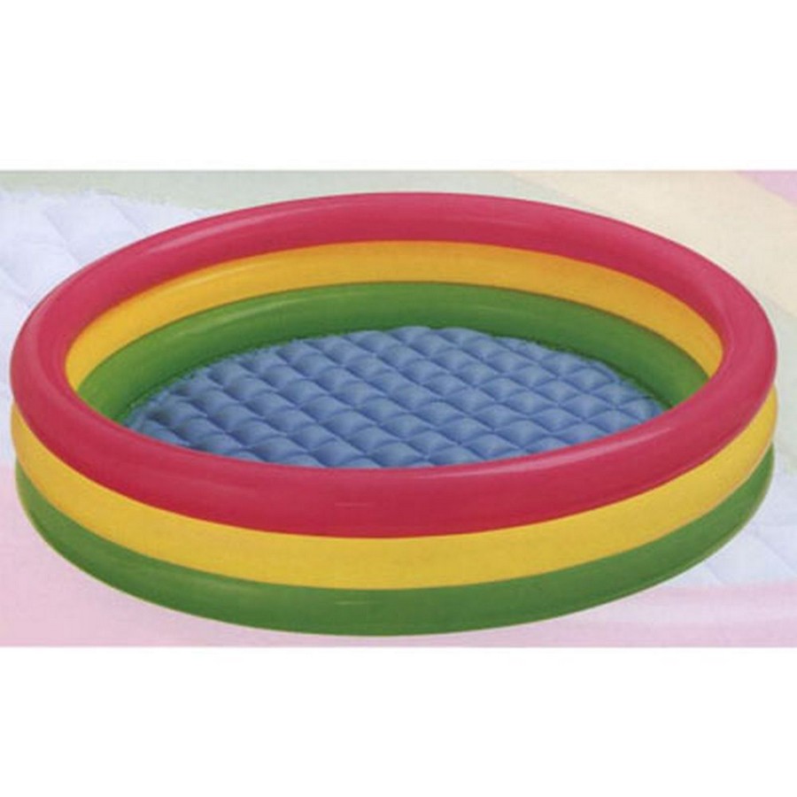 Бассейн надувной детский «Радуга» с надувным полом подойдет для возраста от 3-х лет, модель может выдержать одновременно нескольких детей. Для использования бассейна не требуется специальная подготовка грунта, поэтому его можно использовать где угодно — на даче, на пляже, в помещении. Емкость воды (19см): 136л